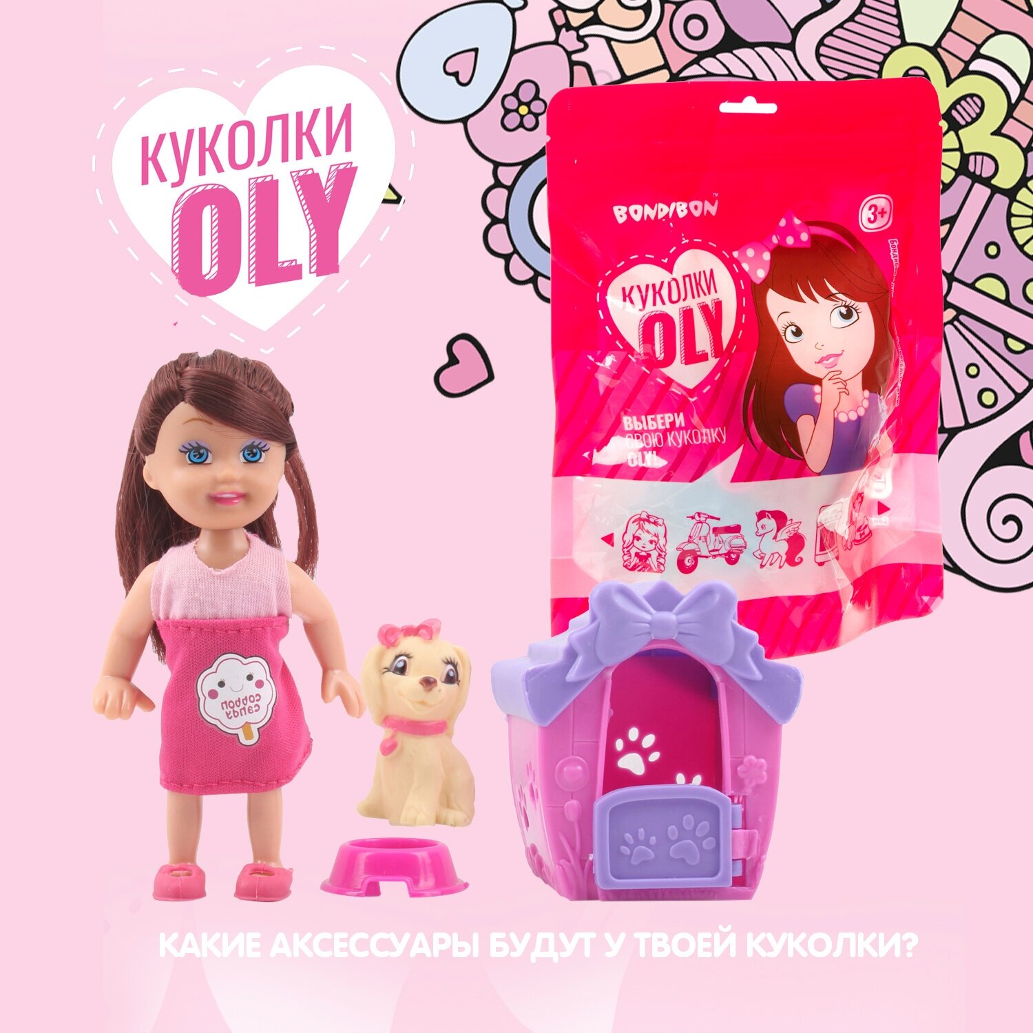 Куклы OLY в пакетиках – это куколки с длинными волосами, с уникальными и интересными аксессуарами: мебелью, питомцами, лошадкой и даже транспортным средством. В этом наборе куколка OLY представлена с милым щенком, украшенным бантиком, а также с мисочкой и домиком для питомца! При изготовлении мини-куколок особое внимание уделяется деталям и разнообразию аксессуаров. Бондибон - для ярких идей и веселых затей!