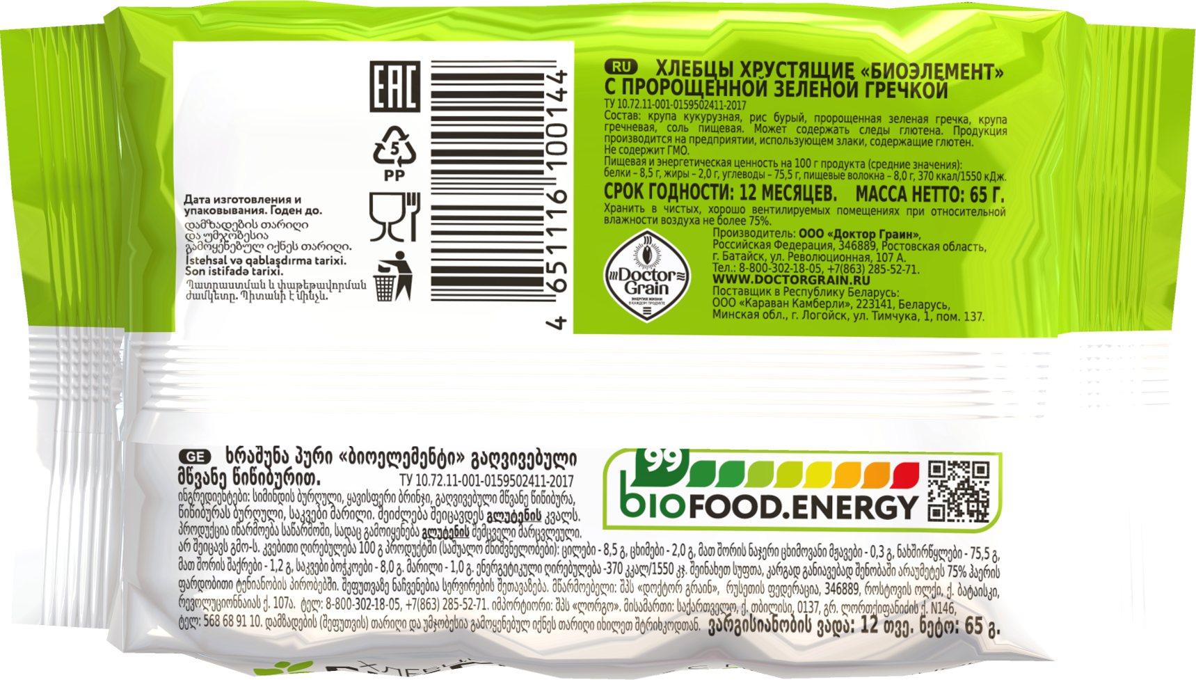 Хлебцы DOCTOR GRAIN BIOELEMENT с пророщенной зеленой гречкой – это полезный и здоровый продукт, который станет отличным дополнением к вашему рациону.Хлебцы изготовлены из пророщенной зеленой гречки, что делает их не только вкусными, но и полезными. Пророщенное зерно содержит больше витаминов и минералов, чем обычное зерно, что делает его более питательным и ценным для здоровья.Хлебцы DOCTOR GRAIN BIOELEMENT производятся методом экструзии, что делает их особенно полезными. Суть этого метода заключается в обработке зерна при высоком давлении и температуре, что позволяет сохранить все полезные свойства продукта.Хлебцы не содержат искусственных добавок, пальмового масла, сахара, консервантов, дрожжей, ГМО, заменителя молочного жира и имеют органический сертификат.Хлебцы имеют форму пластинок и упакованы в пакет. Вес одной упаковки составляет 65 грамм.Хлебцы DOCTOR GRAIN BIOELEMENT с пророщенной зеленой гречкой станут отличным выбором для тех, кто следит за своим здоровьем и питанием. Они подходят для веганов, вегетарианцев и людей, соблюдающих пост.