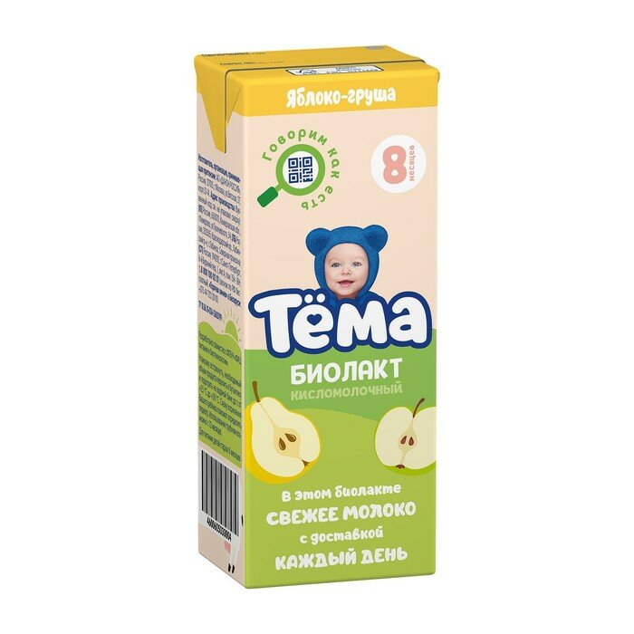 Описание товара:Детский биолакт «Тёма» с яблоком и грушей - вкусный кисломолочный продукт для питания детей старше 8 месяцев. Содержит лактобактерии L.ACIDOPHILUS, полезные для пищеварения. Ингредиенты - исключительно натуральные: яблоки для этого биолакта привозят из солнечной Кубани, а груши - из ЮАР, где они растут круглый год; производится из свежего молока, которое каждый день привозят с местных ферм. Все составляющие проходят строгий контроль качества на всех этапах производства. Тёма. Говорим, как есть.Состав товара:Нормализованное молоко, наполнитель (вода, сахар, пюре яблока концентрированное, пюре груши концентрированное, загуститель - пектины, натуральные ароматизаторы, лимонный мок концентрированный), закваска из термофильных молочнокислых стрептококков (Streptococcus thermophilus) и молочнокислых ацидофильных палочек (Lactobacillus acidophilus).