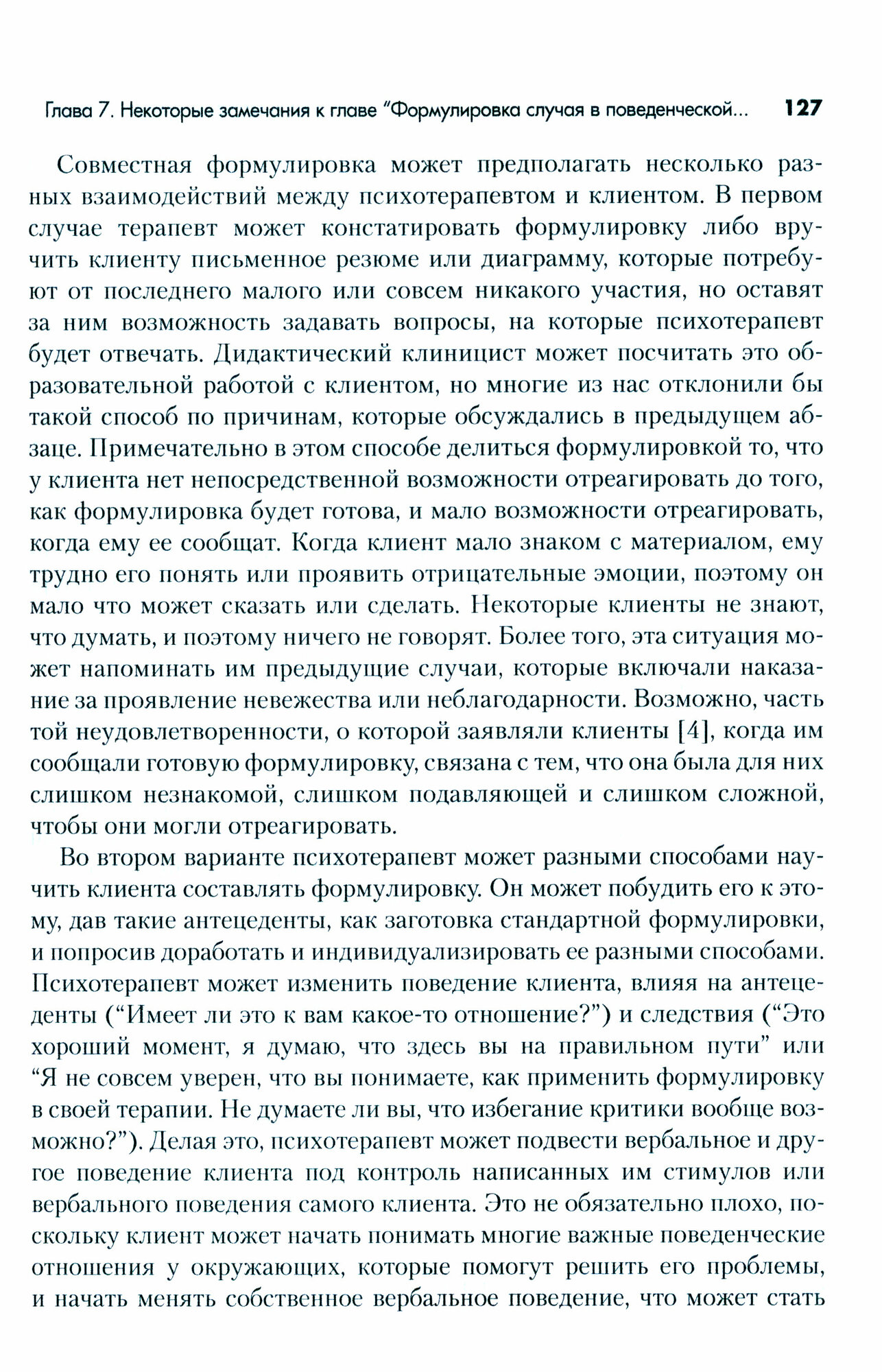 Кроме того, в книге подчеркивается, что формулировка случая в когнитивно-поведенческой терапии — это процедура, которая постоянно используется и переосмысливается на протяжении всего курса лечения.