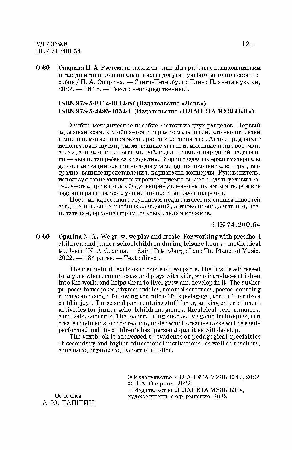 Растем играем и творим Для работы с дошкольниками и младшими школьниками в часы досуга Учебно-методическое пособие (Опарина Нина Александровна); Планета Музыки, 2022