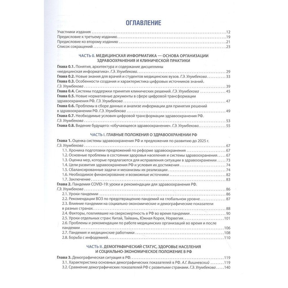 Третье издание национального руководства «Медицинская информатика в общественном здоровье и организации здравоохранения» подготовлено вслед за вторым изданием (2022 г.) в связи с необходимостью расширить представления организаторов здравоохранения в области медицинской информатики в условиях ускорения темпов цифровой трансформации отрасли. Книга написана 85 авторами – ведущими специалистами в сфере демографии, здравоохранения, экономики и управления. Она состоит из 7 частей и 77 глав. По сравнению со вторым изданием в книге появилась новая, «0» часть «Медицинская информатика – основа организации здравоохранения и клинической практики». В ней описаны архитектура и содержание дисциплины, процесс получения и представления новых знаний, тренды развития биомедицинской информатики; сформулированы проблемы на пути цифровизации российского здравоохранения и предложены пути их преодоления. В первой части даны итоговая оценка системы здравоохранения страны, предложения по ее развитию до 2025 г. и анализ уроков пандемии COVID-19. Во второй части рассмотрены показатели здоровья населения, демографические показатели и социально-экономические условия в нашей стране. В третьей части описано состояние системы здравоохранения на макроуровне, в четвертой – организация медицинской помощи на уровне отдельных служб, в пятой – на уровне медицинской организации, включая вопросы информатизации. В шестой части предложены рекомендации по современным методам управления в здравоохранении. Руководство содержит исчерпывающую информацию о результатах, состоянии и деятельности системы здравоохранения РФ, внешних факторах, влияющих на работу отрасли, а также об особенностях управления в этой сфере. Материал структурирован, сопровождается 128 таблицами и 384 рисунками. Руководство предназначено организаторам здравоохранения, врачам всех специальностей, экономистам и демографам.