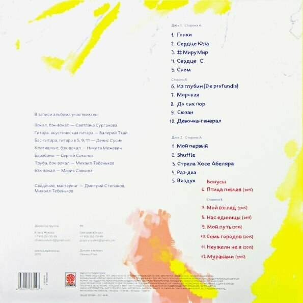 Каталожный номер SZLP-6519-16, Формат 2LP, Лейбл Студия "Союз"1 Гонки 2 Сердце Юла 3 #МируМир 4 Сердце С. 5 Сном 6 Из глубин (The Profundis) 7 Морская 8 До сих пор 9 Сюзан 10 Девочка-генерал 1 Вот он мой первый 2 Shuffle 3 Стрела 4 Раз-два 5 Воздух 6 Птица певчая (2015) 7 Мой взгляд (2015) 8 Нас единицы (2015) 9 Мой путь (2015) 10 Семь городов (2015) 11 Неужели не я (2015) 12 Мураками (2015)Acoustic Guitar - Денис СусинBacking Vocals - Мария СавкинаBass Guitar - Денис СусинDrums - Сергей СоколовGuitar, Acoustic Guitar - Валерий ТхайKeyboards, Backing Vocals - Никита МежевичLead Vocals, Backing Vocals - Светлана СургановаTrumpet, Backing Vocals - Михаил Тебеньков