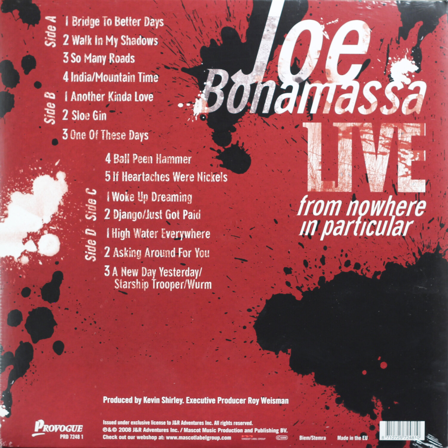 Joe Bonamassa - Live From Nowhere In Particular (2 LP) - новая пластинка в заводской пленке "Still Sealed (SS)"; Производитель: MPO International; Страна производства: Франция Live from Nowhere in Particular — третий концертный альбом американского блюз-рок-музыканта Джо Бонамассы. Спродюсированный Кевином Ширли, он был выпущен 19 августа 2008 года компанией J&R Adventures и возглавил чарт Billboard Top Blues Albums США. Треклист: A1 Bridge To Better DaysA2 Walk In My ShadowsA3 So Many RoadsA4 India / Mountain TimeB1 Another Kind Of LoveB2 Sloe GinB3 One Of These DaysB4 Ball Peen HammerB5 If Heartaches Were NickelsC1 Woke Up DreamingC2 Django / Just Got PaidD1 High Water EverywhereD2 Asking Around For YouD3 A New Day Yesterday / Starship Trooper / Wurm