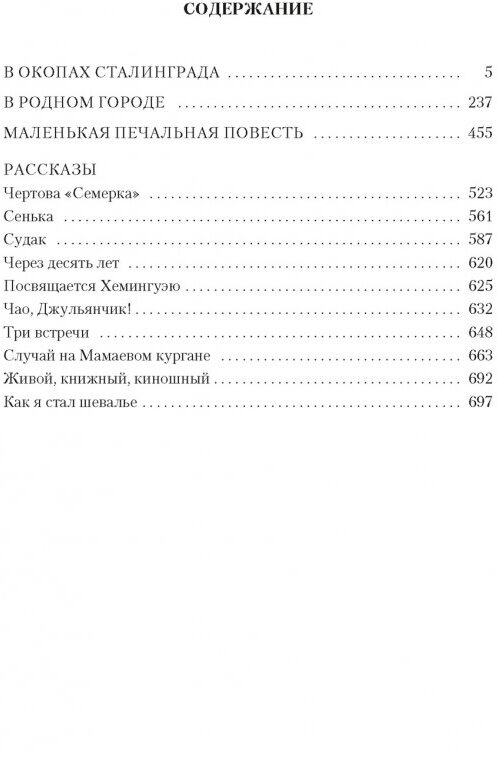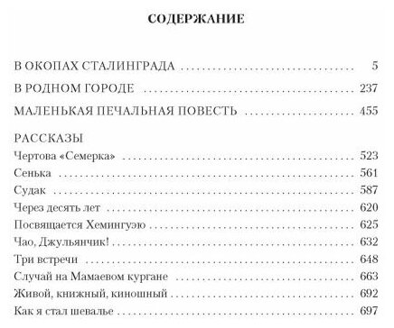 В произведениях, вошедших в сборник, нашла свое отражение удивительная судьба Виктора Платоновича Некрасова (1911–1987) — писателя, архитектора, военного сапера, эмигранта. Повесть «В окопах Сталинграда» была опубликована почти сразу после войны, в 1946 году, быстро получила признание и стала одним из первых образцов «лейтенантской прозы» — литературы, честно, без пафоса и ложной патетики рассказывающей о человеке в бесчеловечных условиях войны. Книга «В родном городе» (1954) — о том, как трудно по-настоящему вернуться с войны, заново обрести себя. Написанная уже в эмиграции «Маленькая печальная повесть» (1985) — об утрате иллюзий, о непрочности дружеских союзов и жизненных принципов, о соблазнах славы. Мастерство Некрасова-прозаика в полной мере проявляется и в его психологически точных и виртуозно написанных рассказах.