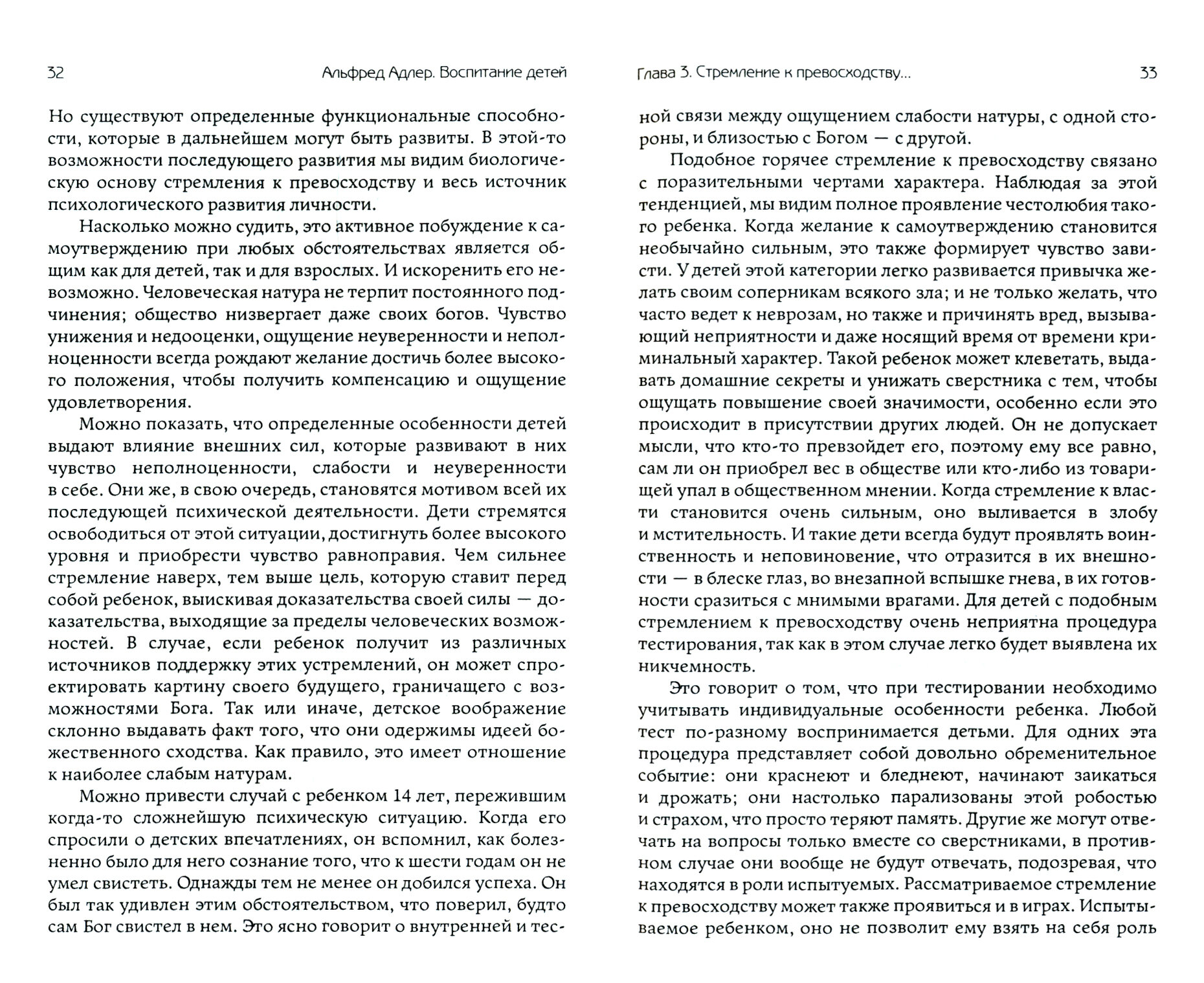 Книга одного из крупнейших психологов ХХ века Альфреда Адлера, создавшего собственное направление в психологии, посвящена рассмотрению проблем формирования психики ребенка и проблем воспитания, что позволяет рассматривать Адлера не только как великого психолога, но и талантливого педагога. Ключевыми понятиями теории являются "комплекс неполноценности" и "стремление к власти" - основные движущие силы человека на пути к саморазвитию. В результате неминуемого столкновения с такими жизненными проблемами, как любовь, профессиональная деятельность, положение в социуме, человек стремится к личному превосходству, власти и значимости посредством активизации социального интереса. По мнению Адлера, каждый человек имеет определенный "жизненный стиль", базирующийся на неосознаваемом воздействии воспитательного процесса и социальной адаптации. В первую очередь главенствующую роль играет семья, как самая значимая социальная группа, в которую ребенок попадает с рождения. Наиболее важным Адлер считает подготовку ребенка к его общественной роли в соответствии с гендерной принадлежностью - роль женщины или мужчины.