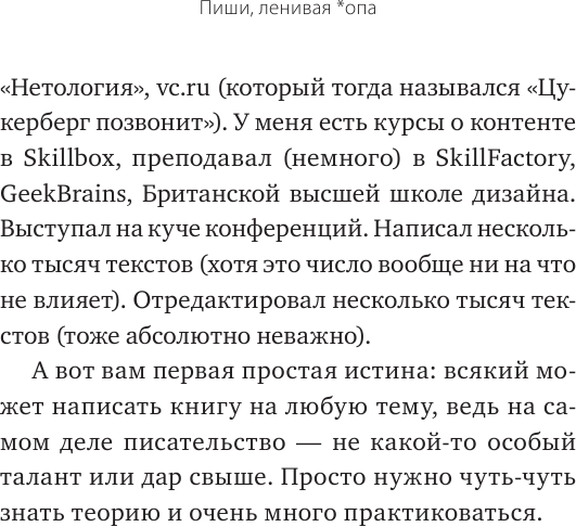 Эта книга о мотивации, умении разговаривать и мышлении. Она не о том, как научиться писать (этому вас научат другие книги, и в конце книги есть их список), не о волшебных таблетках, после которых умеешь все. Книга эта - про голову и ее правильный настрой.