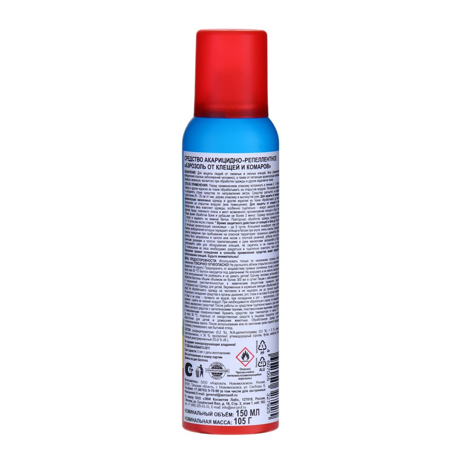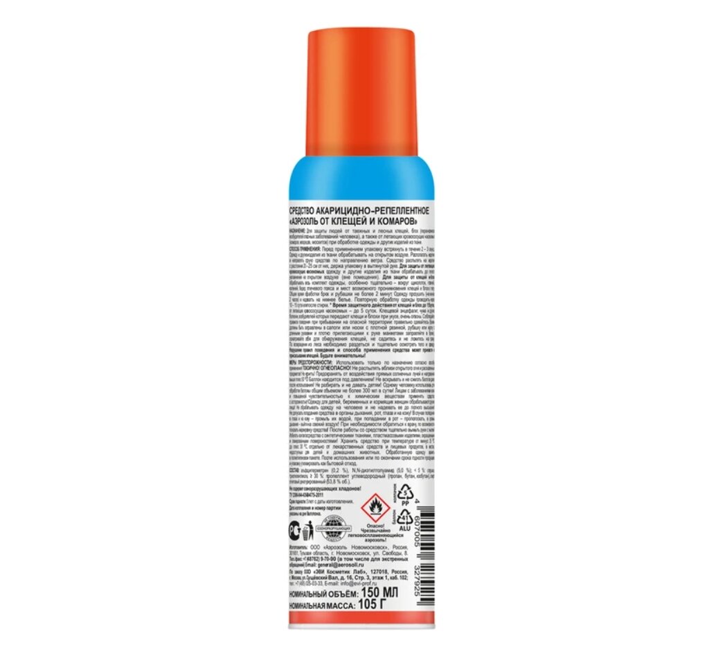 Предназначен для защиты людей от таежных и лесных клещей, блох (переносчиков воз-будителей опасных заболеваний человека), а также от летающих кровососущих насеко-мых (комаров, мокрецов, москитов) при обработке одежды и других изделий из ткани. Способ применения: перед применением баллон встряхивать в течение 2-3 секунд. Одежду и другие изделия из ткани обрабатывать на открытом воздухе (в защищенном от ветра месте). Располагать одежду и направлять струю средства по направлению ветра. Средство распылять на изделия с расстояния 20-25 см от них, держа упаковку в вытянутой руке. После обработки одежду просушить.