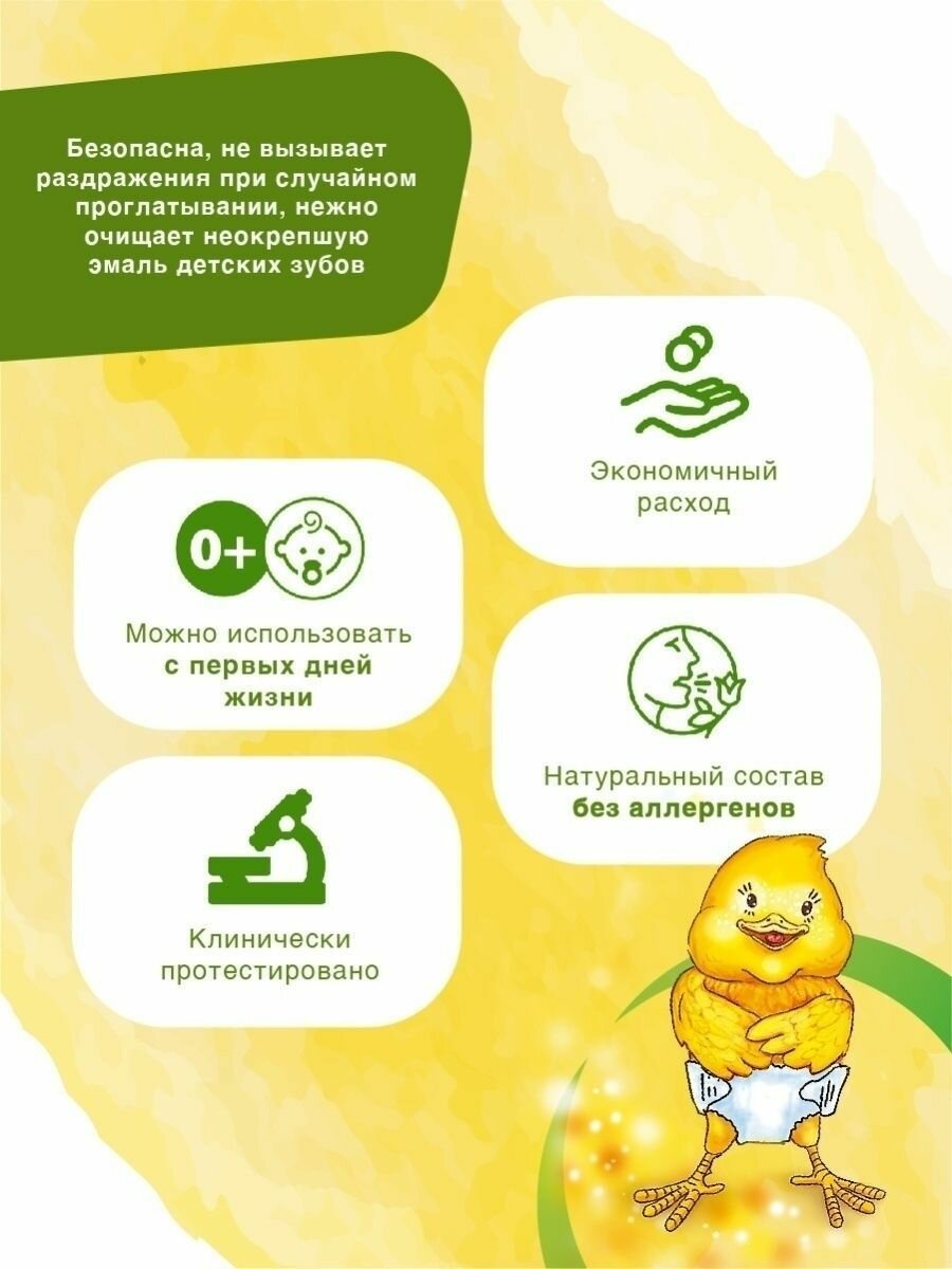 Зубная паста детская со вкусом банана не содержит фтора, мела и ментола. Мягкая чистящая система на основе современного абразива не травмирует нежную детскую эмаль. Паста не вызывает раздражения слизистой при случайном проглатывании. Предназначена для детей с 1 года до 4 лет. Рекомендуется для ухода за молочными зубами.