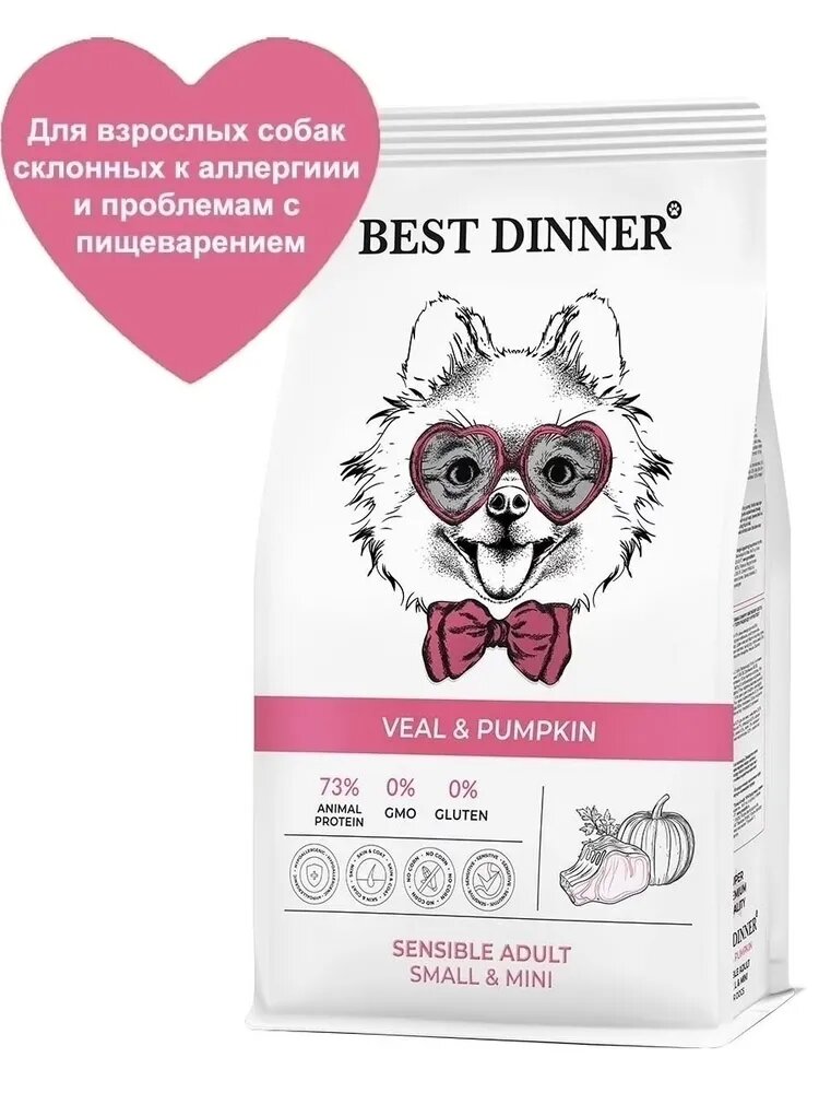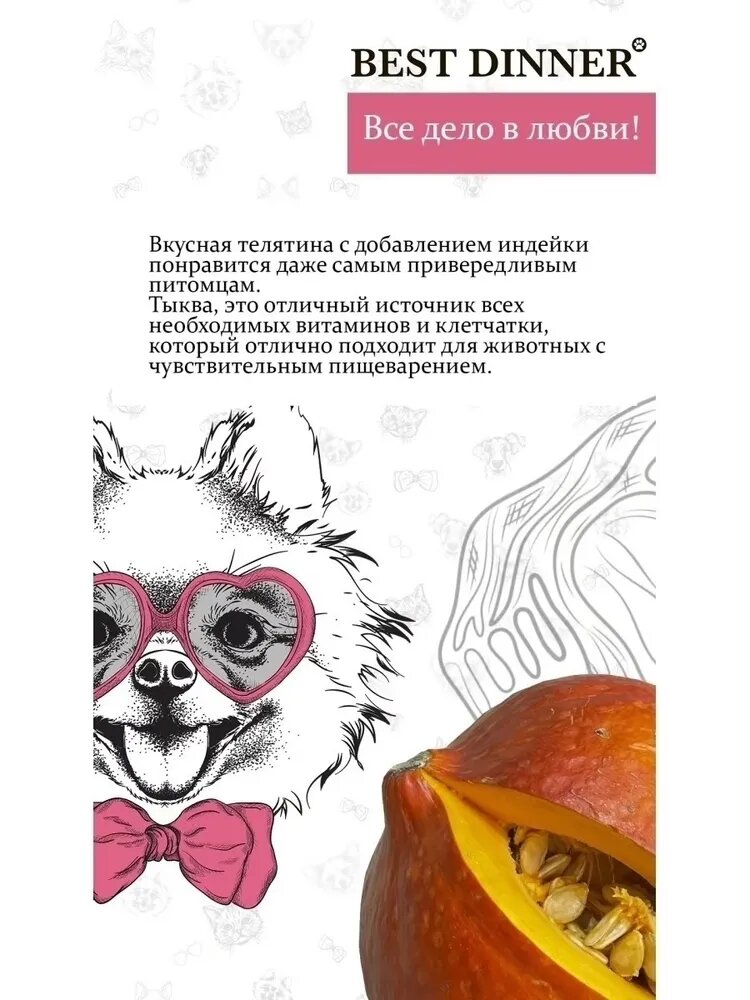 Высококачественный полнорационный корм для собак мелких пород Best Dinner с телятиной и тыквой создан специально для собак с особыми потребностями. Вкусная телятина с добавлением индейки понравится даже самым привередливым питомцам. Корень цикория способствует росту полезной кишечной микрофлоры и улучшению усвояемости корма. Тыква, это отличный источник всех необходимых витаминов и клетчатки, который отлично подходит для животных с чувствительным пищеварением.