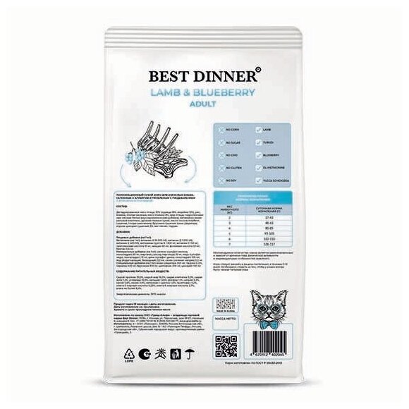 Высококачественный полнорационный корм для кошек Best Dinner с ягненком и голубикой, создан с учетом физиологических потребностей кошек. Нежное мясо ягненка легко усваивается и не нагружает пищеварительный тракт, благодаря чему данный корм подходит для кошек склонных к аллергии и проблемам с пищеварением. Голубика богата витаминами и антиоксидантами, способствующая укреплению иммунитета. Брусника, плоды шиповника, добавленные в рецептуру, профилактируют мочекаменную болезнь, а Юкка Шидигера прекрасно подойдет для вывода шерсти и устранения неприятных запахов из лотка. Гранулы в форме сердечек не оставят равнодушными даже самых привередливых кошек.
