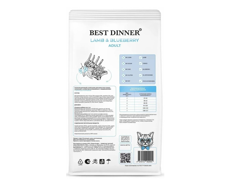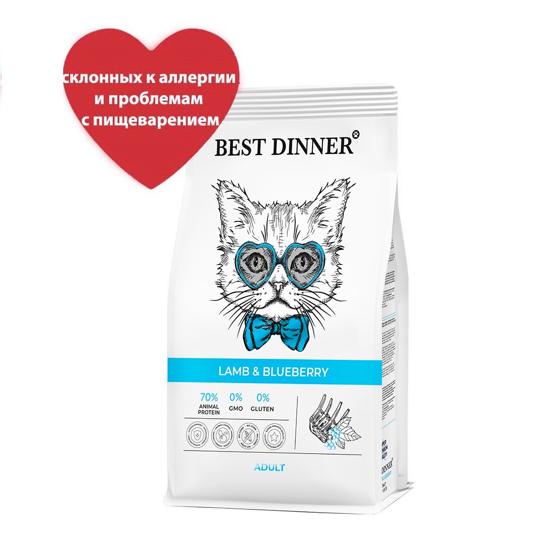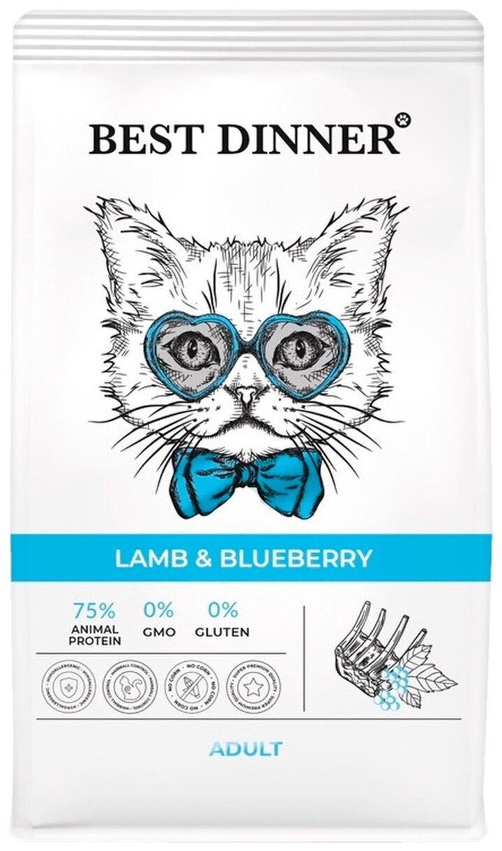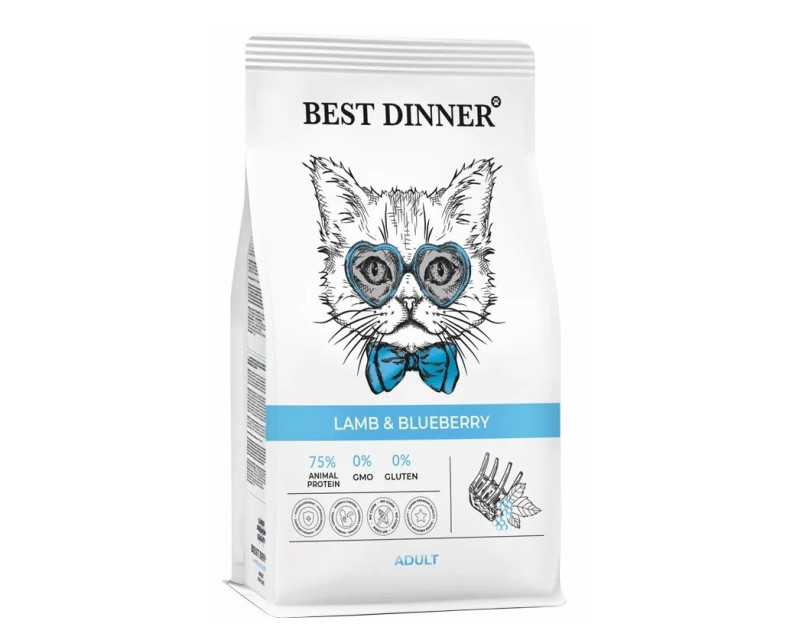 Высококачественный полнорационный корм для кошек Best Dinner с ягненком и голубикой, создан с учетом физиологических потребностей кошек. Нежное мясо ягненка легко усваивается и не нагружает пищеварительный тракт, благодаря чему данный корм подходит для кошек склонных к аллергии и проблемам с пищеварением. Голубика богата витаминами и антиоксидантами, способствующая укреплению иммунитета. Брусника, плоды шиповника, добавленные в рецептуру, профилактируют мочекаменную болезнь, а Юкка Шидигера прекрасно подойдет для вывода шерсти и устранения неприятных запахов из лотка. Гранулы в форме сердечек не оставят равнодушными даже самых привередливых кошек.
