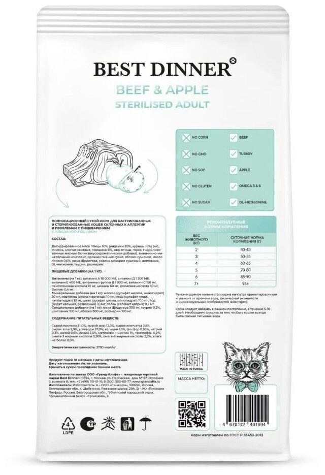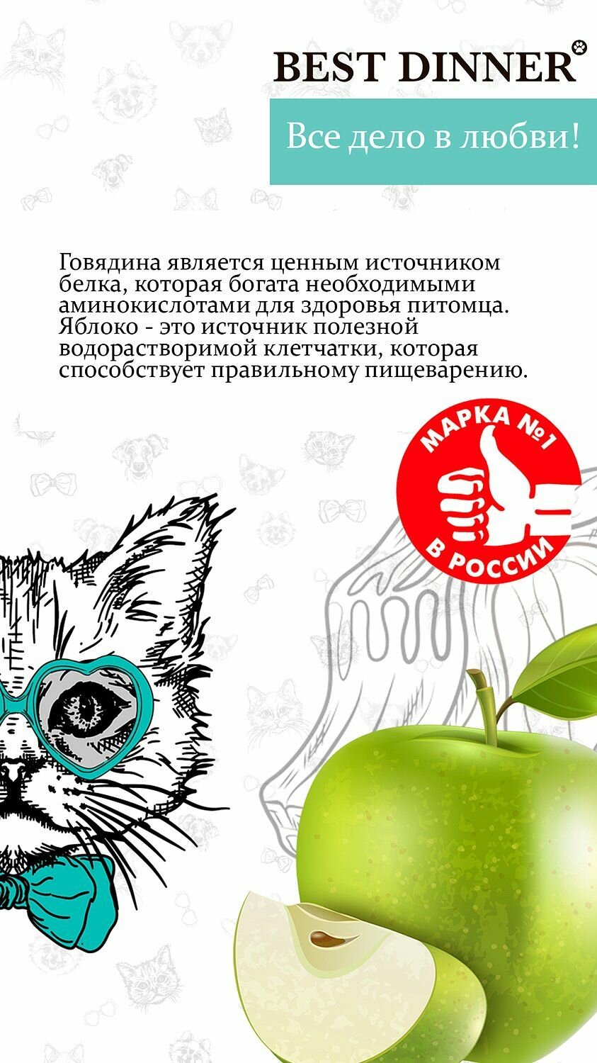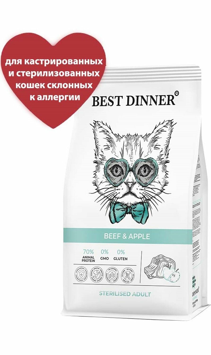 Высококачественный полнорационный корм для кошек Best Dinner с говядиной и яблоком, создан с учетом физиологических потребностей кошек. Говядина является ценным источником белка, которая богата необходимыми аминокислотами для здоровья питомца. Яблоко - это источник полезной водорастворимой клетчатки, которая способствует правильному пищеварению. Розмарин богатый источник антиоксидантов, способствующий укреплению иммунитета, а ягоды шиповника и DL-метионин профилактируют мочекаменную болезнь. Гранулы в форме сердечек не оставят равнодушными даже самых привередливых кошек.