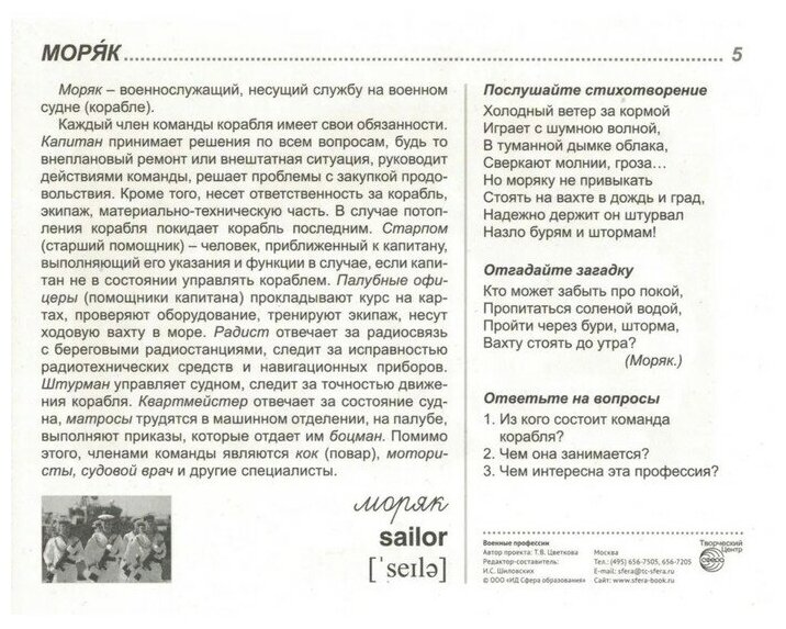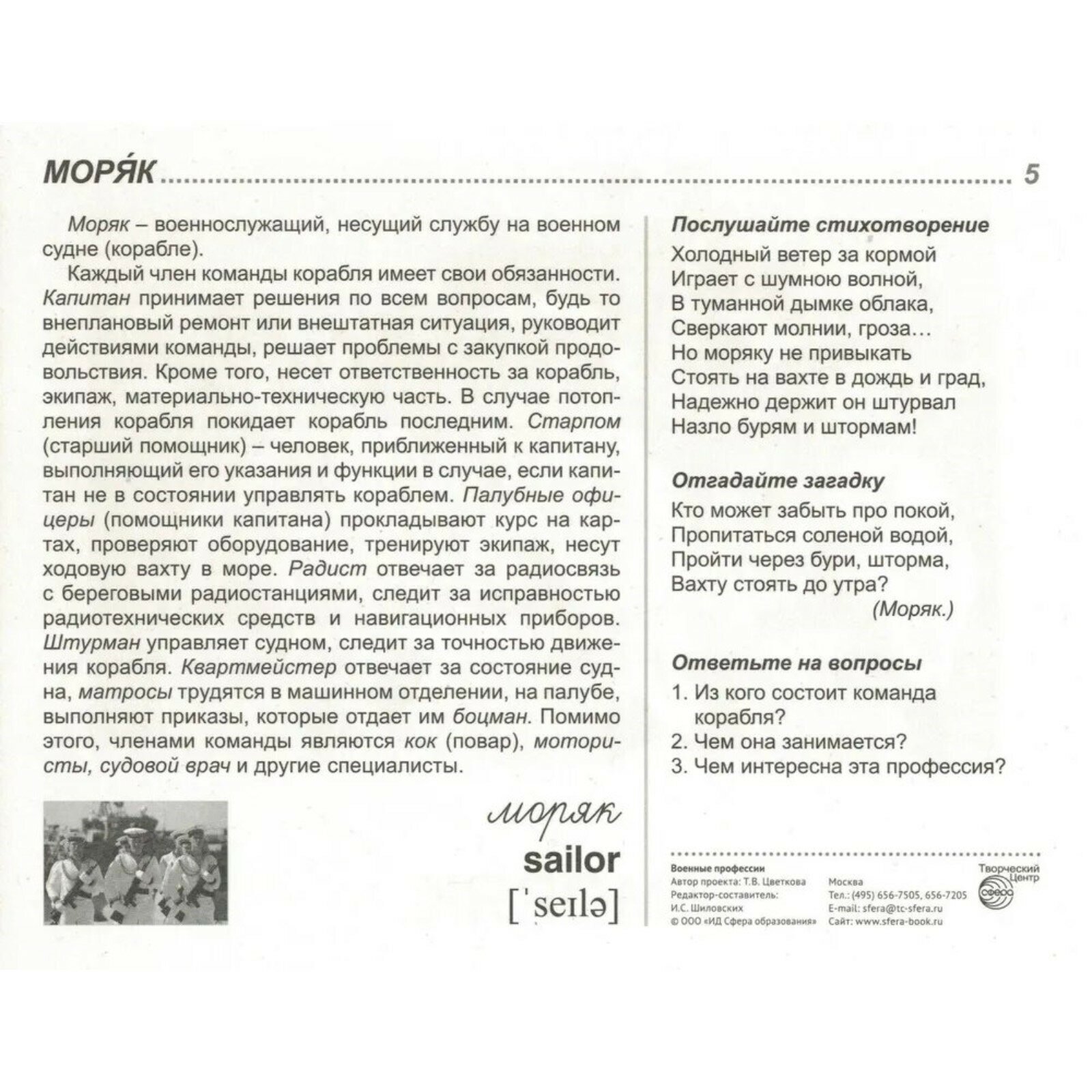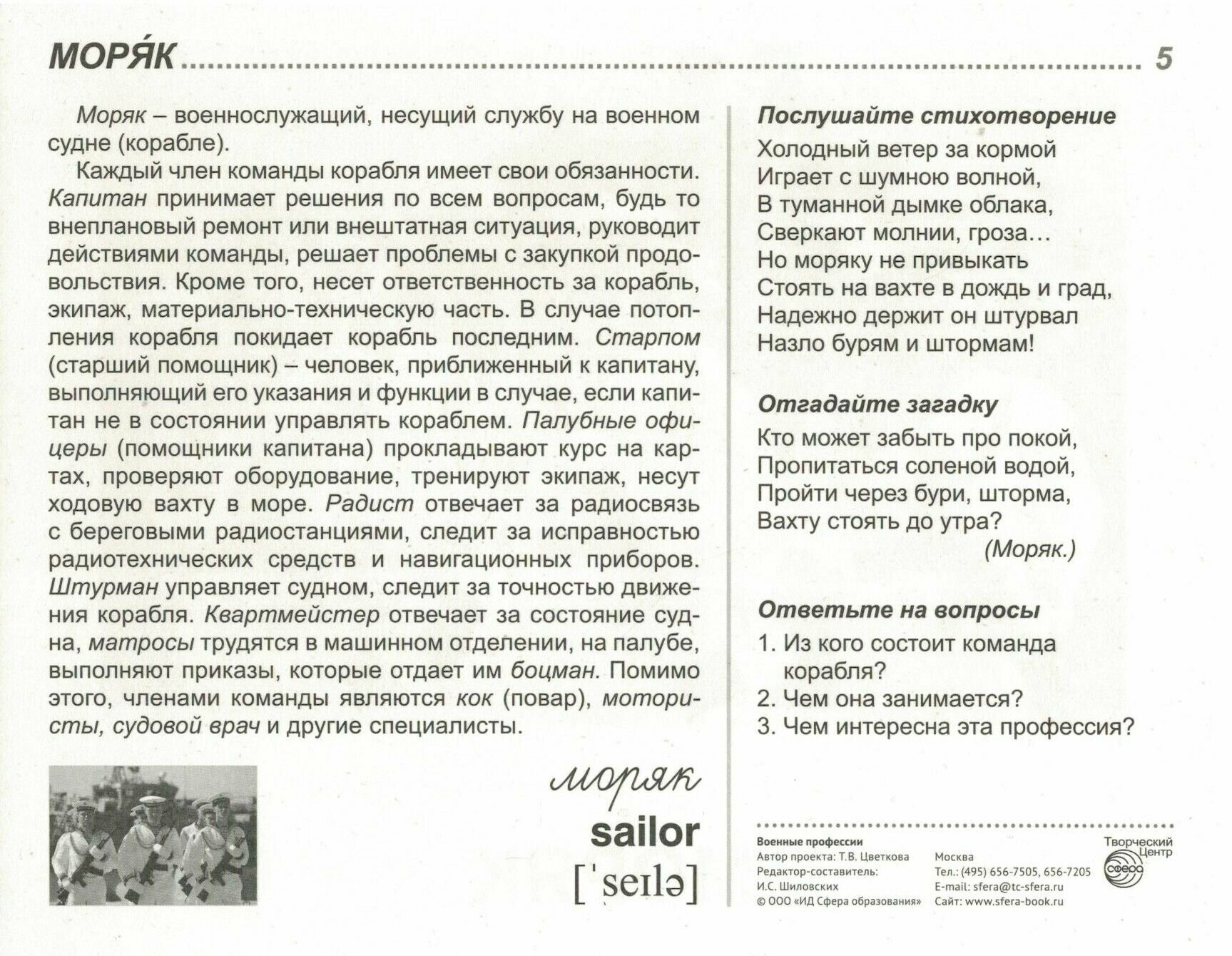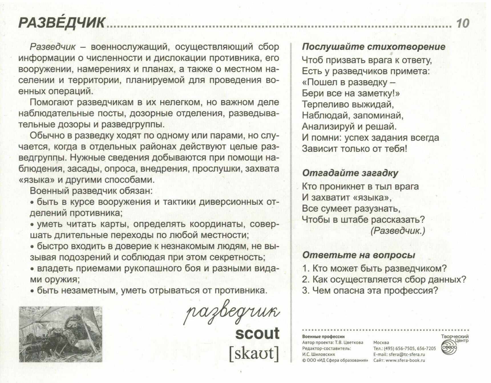 На лицевой стороне каждой карточки дается цветное изображение военнослужащего определенной военной специальности, на обратной — подробное описание, из которого дети узнают немало важных фактов о военной службе и образцах вооружения. Для лучшего закрепления материала представлены оригинальные стихотворения и рифмованные загадки по теме, а также вопросы, на которые ребенок ответит после изучения материала или беседы со взрослым.