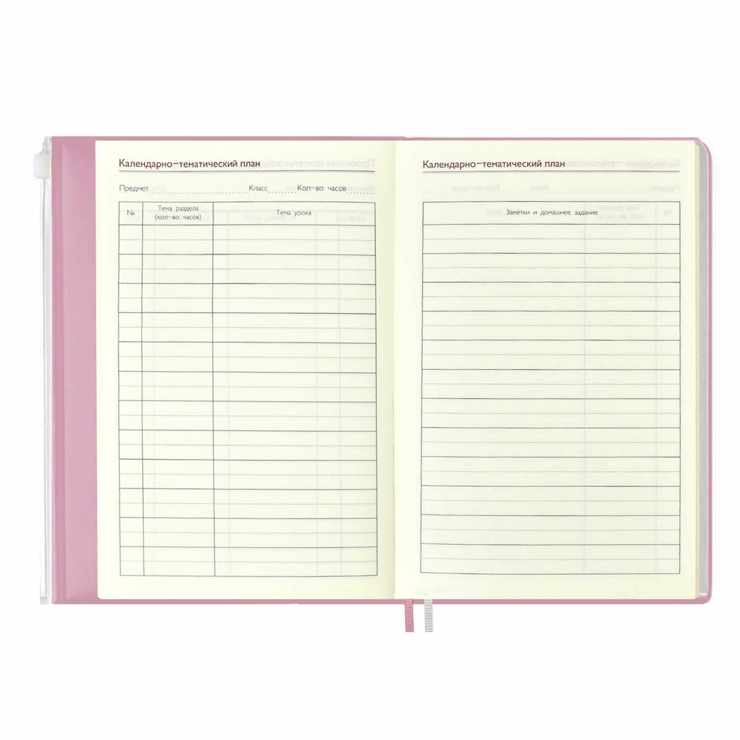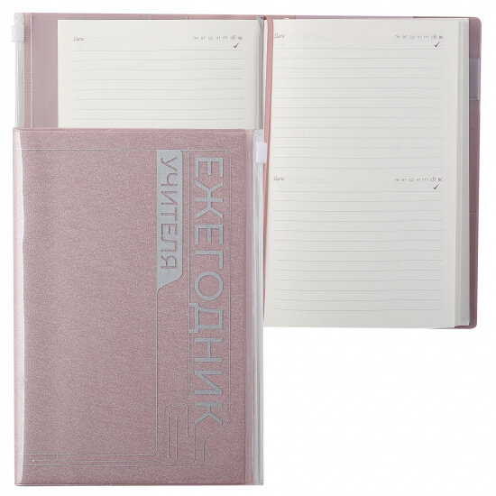 Ежегодник учителя. ПВХ РОЗОВЫЙ. Размер: 125x178 мм. Формат А6+. Количество листов - 256 л. Тип обложки - мягкий переплёт. Материал обложки - ПВХ. Отделка обложки: шелкография в одну краску. Особенности: съёмная обложка, функциональный карман на гибкой молнии как часть обложки, карманы для визиток и документов. Цвет внутреннего блока - кремовый офсет. Плотность бумаги 70 г/м?. Красочность блока: печать в две краски. Индивидуальная упаковка: ПЭТ-пакет.