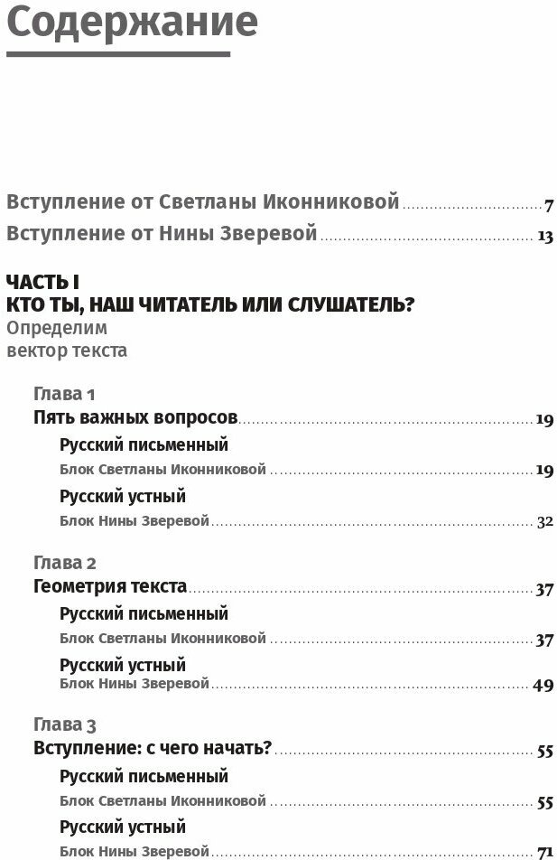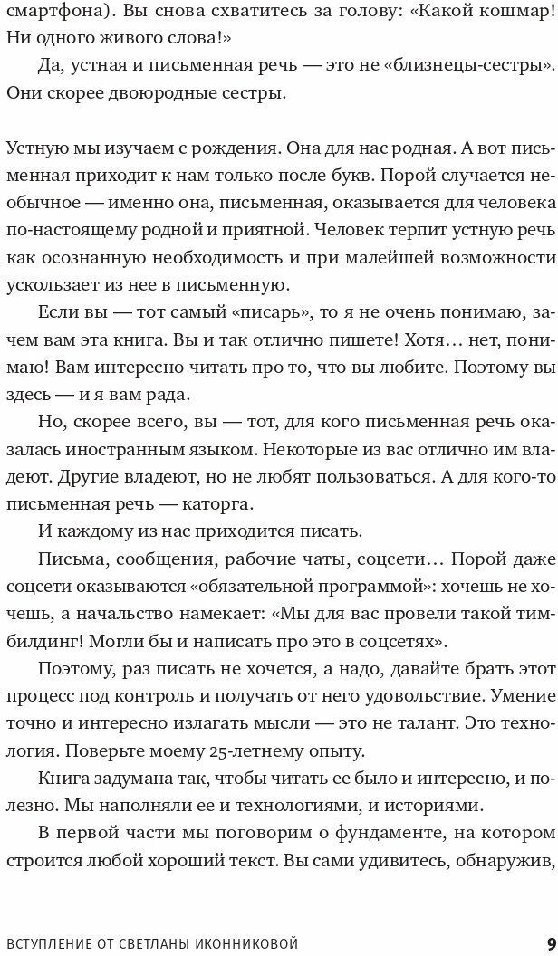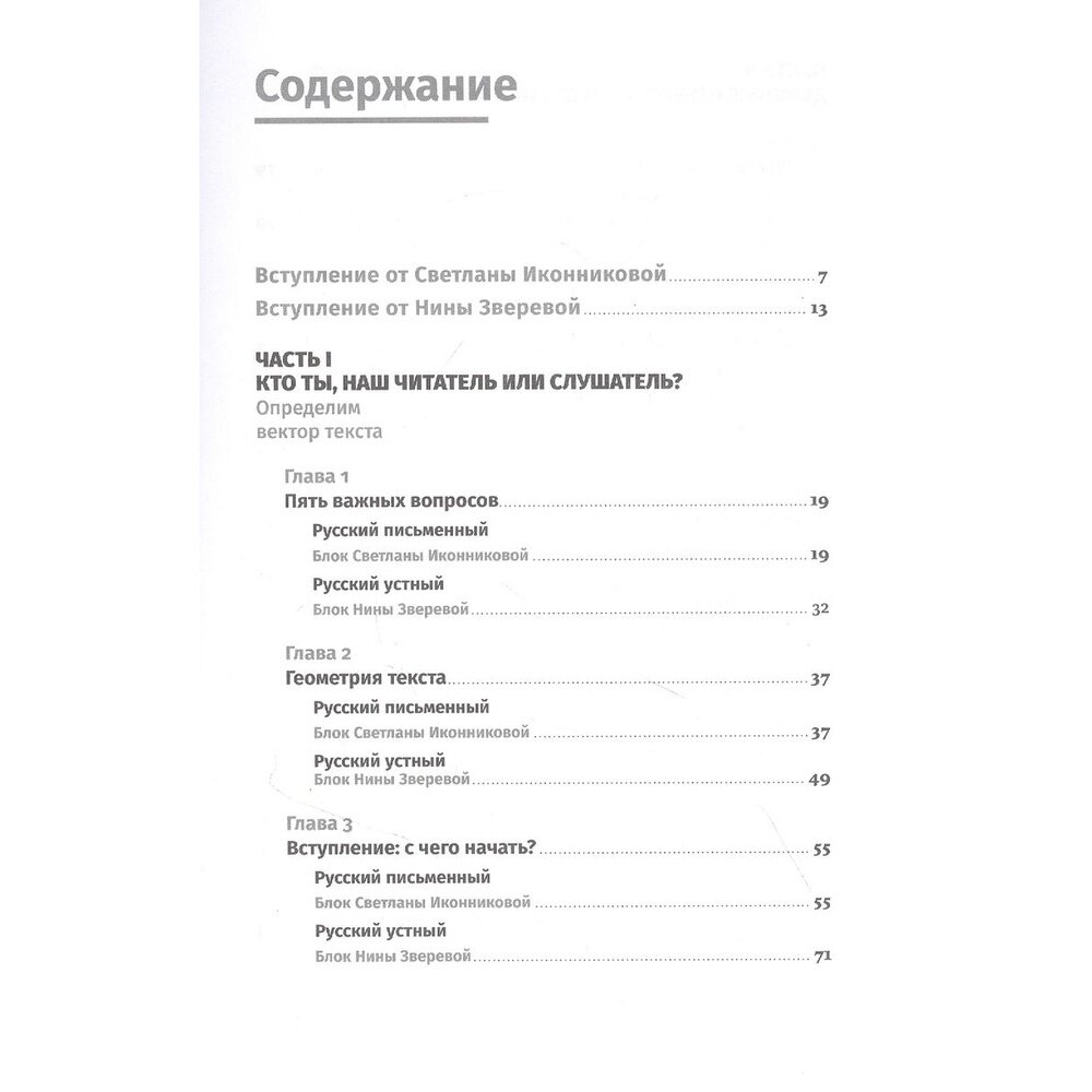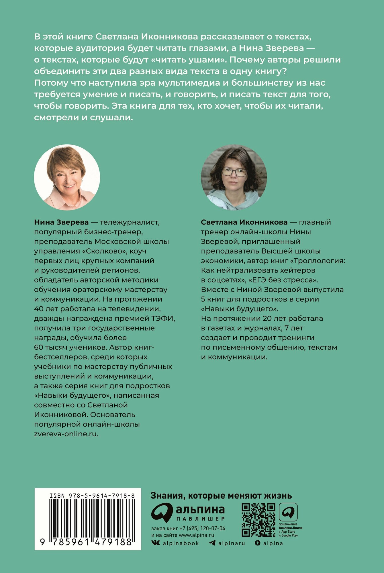В этой книге Светлана Иконникова, тренер по написанию текстов, рассказывает, как точно и убедительно излагать мысли в деловой переписке, соцсетях и мессенджерах, а Нина Зверева, известная телеведущая, бизнес-тренер, автор бестселлеров, объяснит, как создать идеальный текст для выступления. Как передать интонацию на письме, что такое геометрия и вектор текста, с чего он должен начинаться, для кого пишется, как зацепить внимание слушателя и читателя с первой фразы, интересные истории из практики, упражнения и советы — эта книга для тех, кто хочет, чтобы его читали, смотрели и слушали.