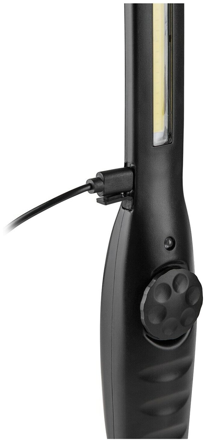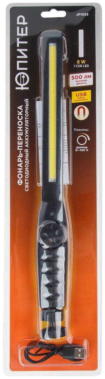 USB-кабель для зарядки в комплекте поможет зарядить фонарь в любом месте при наличии USB-зарядки, подключение к Power Bank может продлить время работы. Диммируемый источник света создает действительно яркий свет на максимальной мощности. Встроенный Li-ion аккумулятор заряжается гораздо быстрее классических аккумуляторов. Эргономичная форма и яркий рассеянный свет станут незаменимым помощником любому автомеханику. Магнит поможет зафиксировать фонарь на металлической (магнитной) поверхности, а подвес зафиксировать фонарь в иных ситуациях.