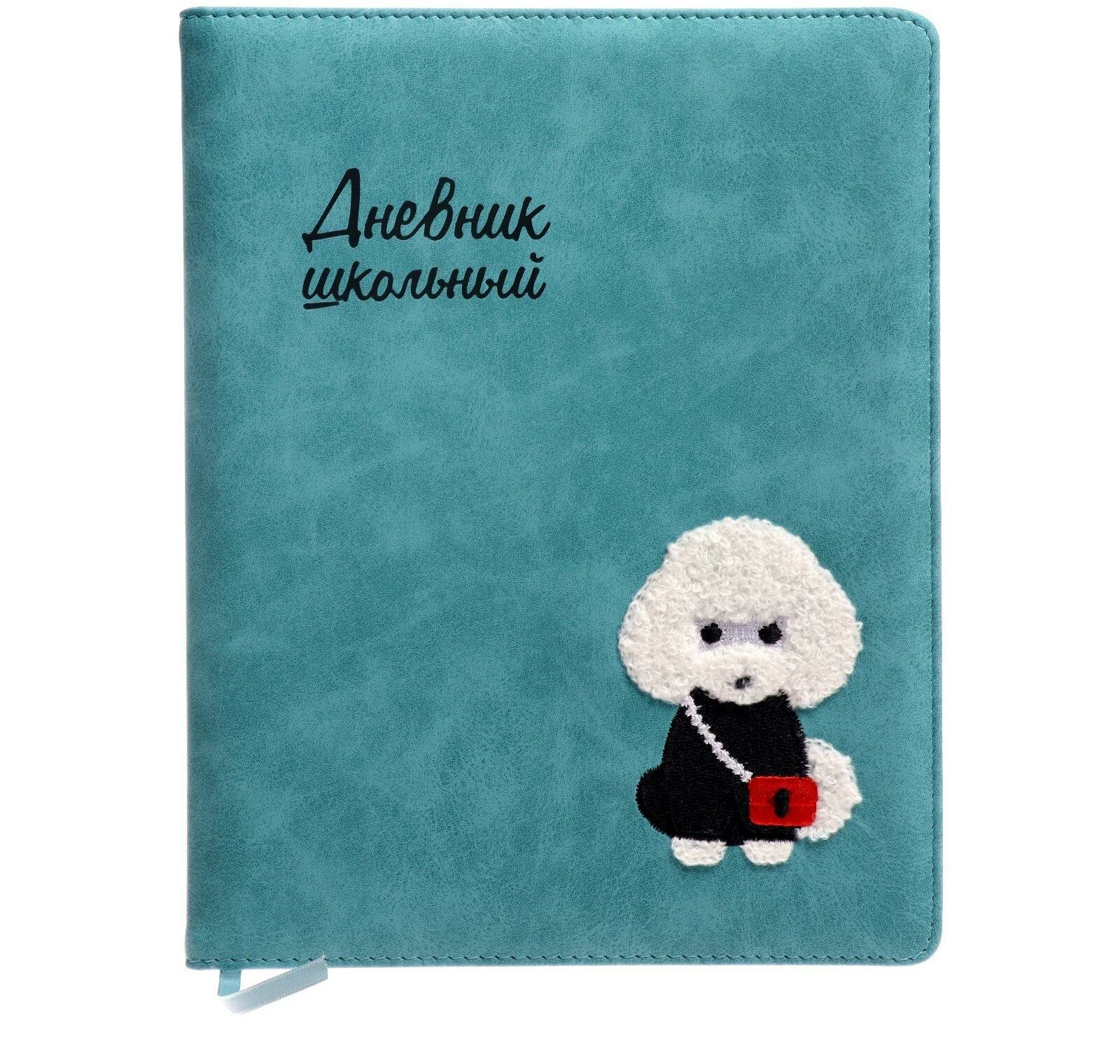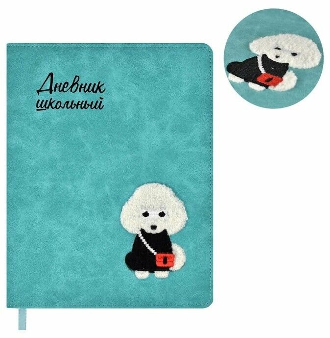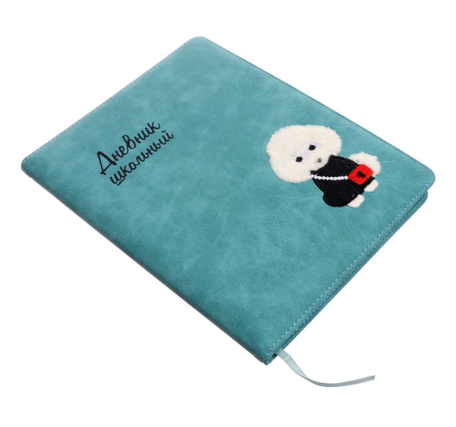 Дневник школьный, ПУДЕЛЬ формат А5+, 48 л., твёрдый переплёт с поролоном, вышивка, тиснение фольгой, углы обложки закруглённые, углы блока закруглённые, одно ляссе, красочность блока: печать в одну краску, красочность форзаца: печать пантоном. Блок: бумага - белый офсет, 80 г/м?, универсальная шпаргалка.