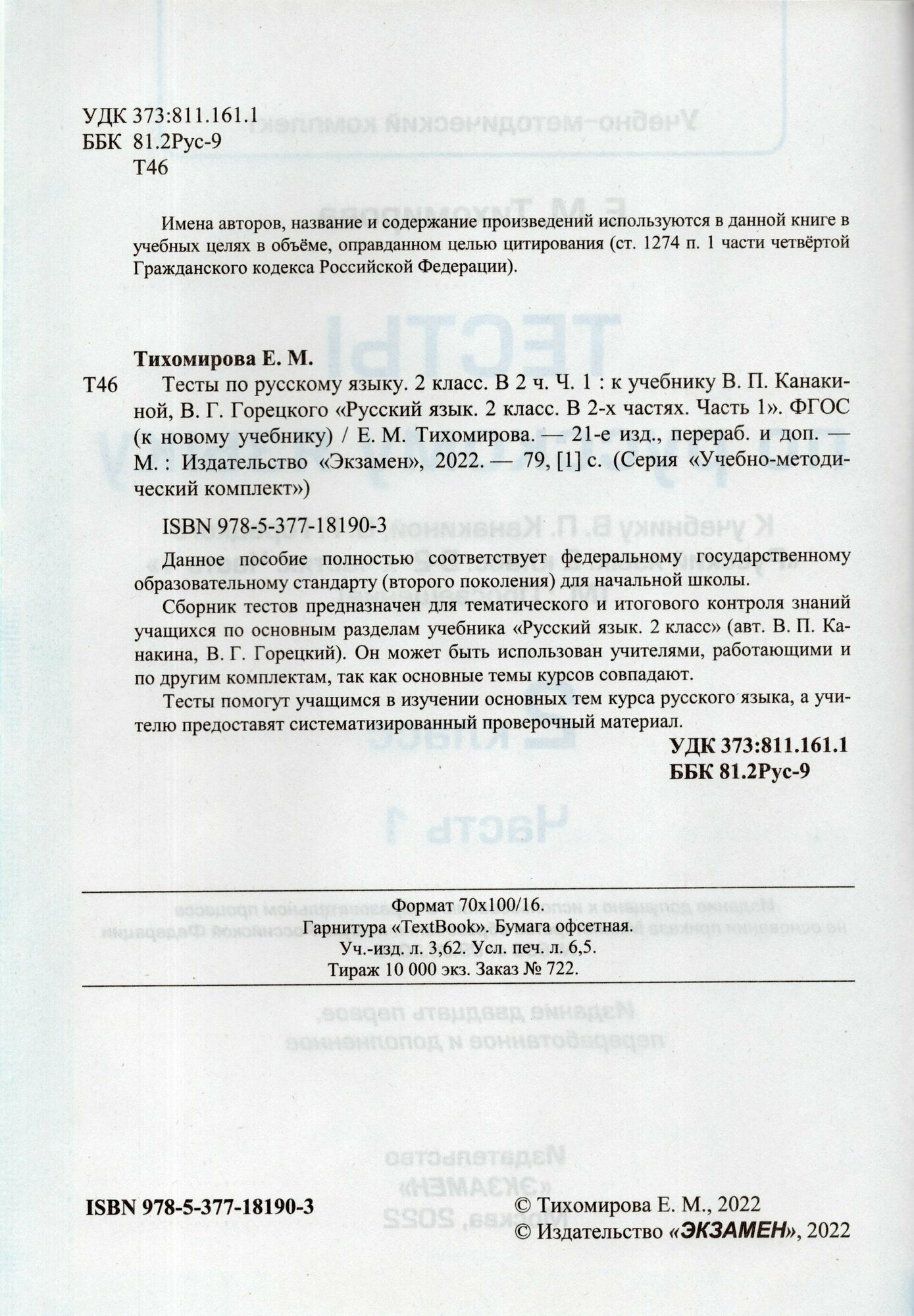 Тесты по русскому языку 2 класс Часть 1 К учебнику В П Канакиной В Г Горецкого (Елена Михайловна Тихомирова); Экзамен, 2022