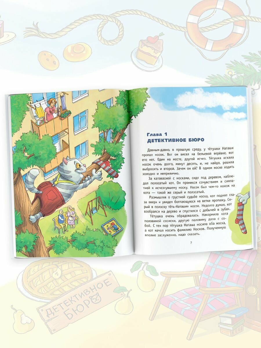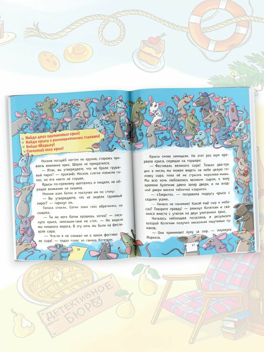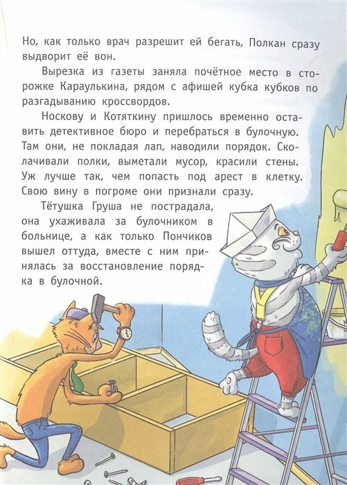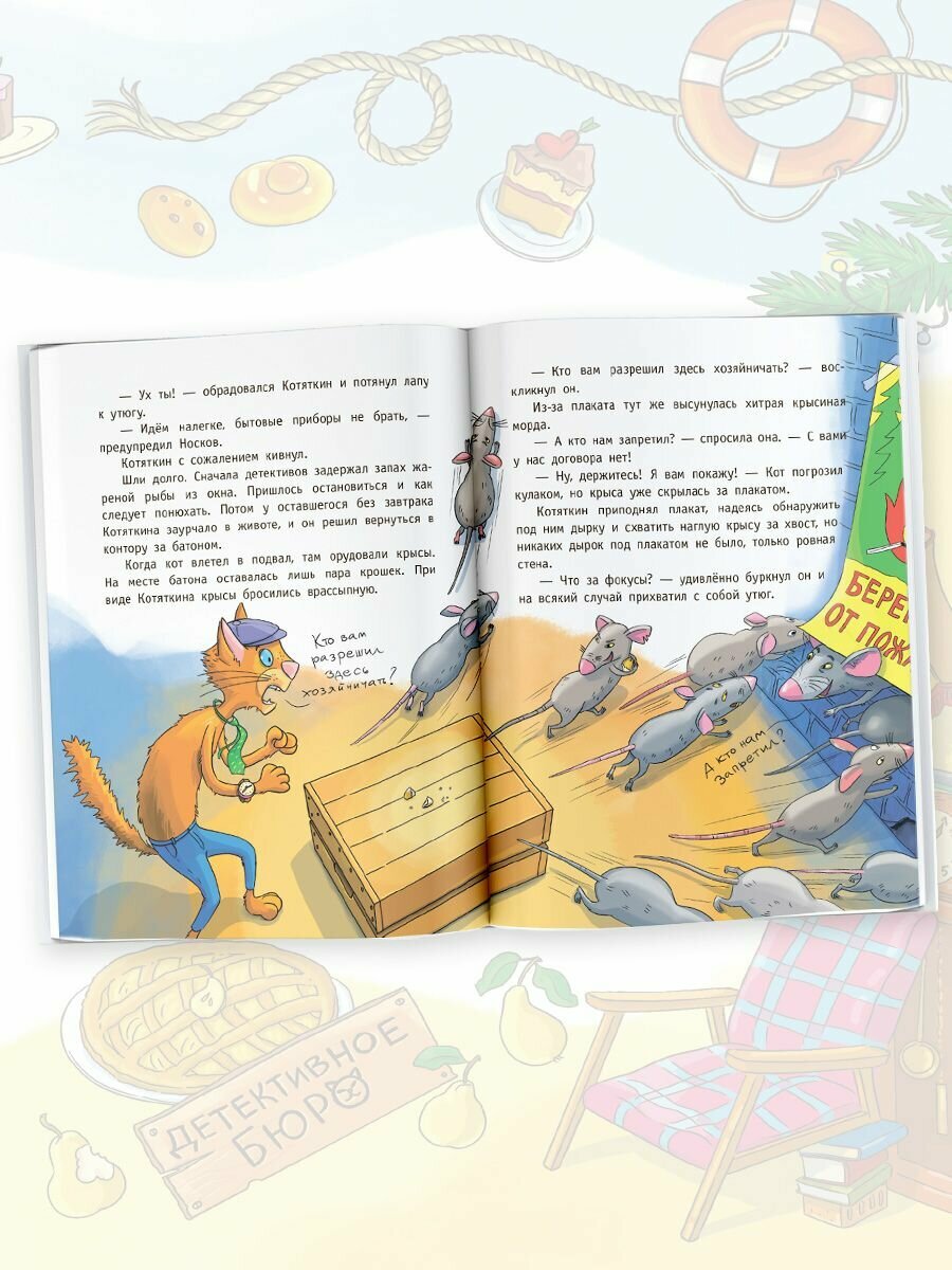Это первая история о горе-сыщиках Носкове и Котяткине. Коты-сыщики Носков и Котяткин - те ещё ребята. С их помощью дело об ограблении булочной запутывается окончательно, повар Пончиков вынужден вместо свежих булочек делать свежий ремонт, сторож Караулькин менять штаны, а крыса разгуливать в гипсе.