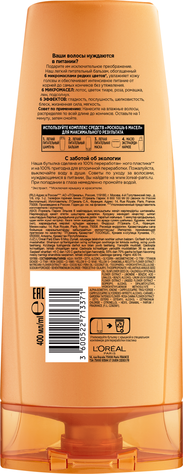 Бальзам для волос L’Oreal Paris Elseve Роскошь 6 масел 400мл / Нанесите на влажные волосы, затем тщательно смойте. Используйте регулярно.