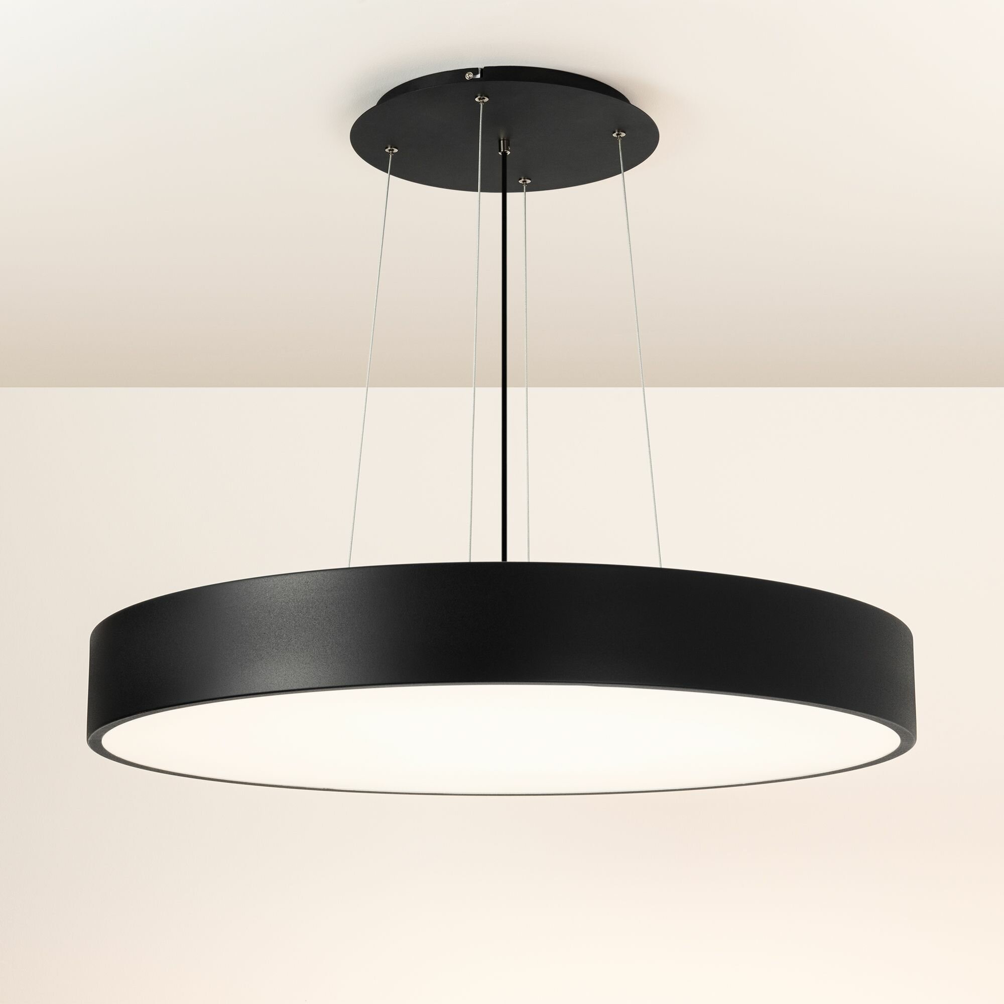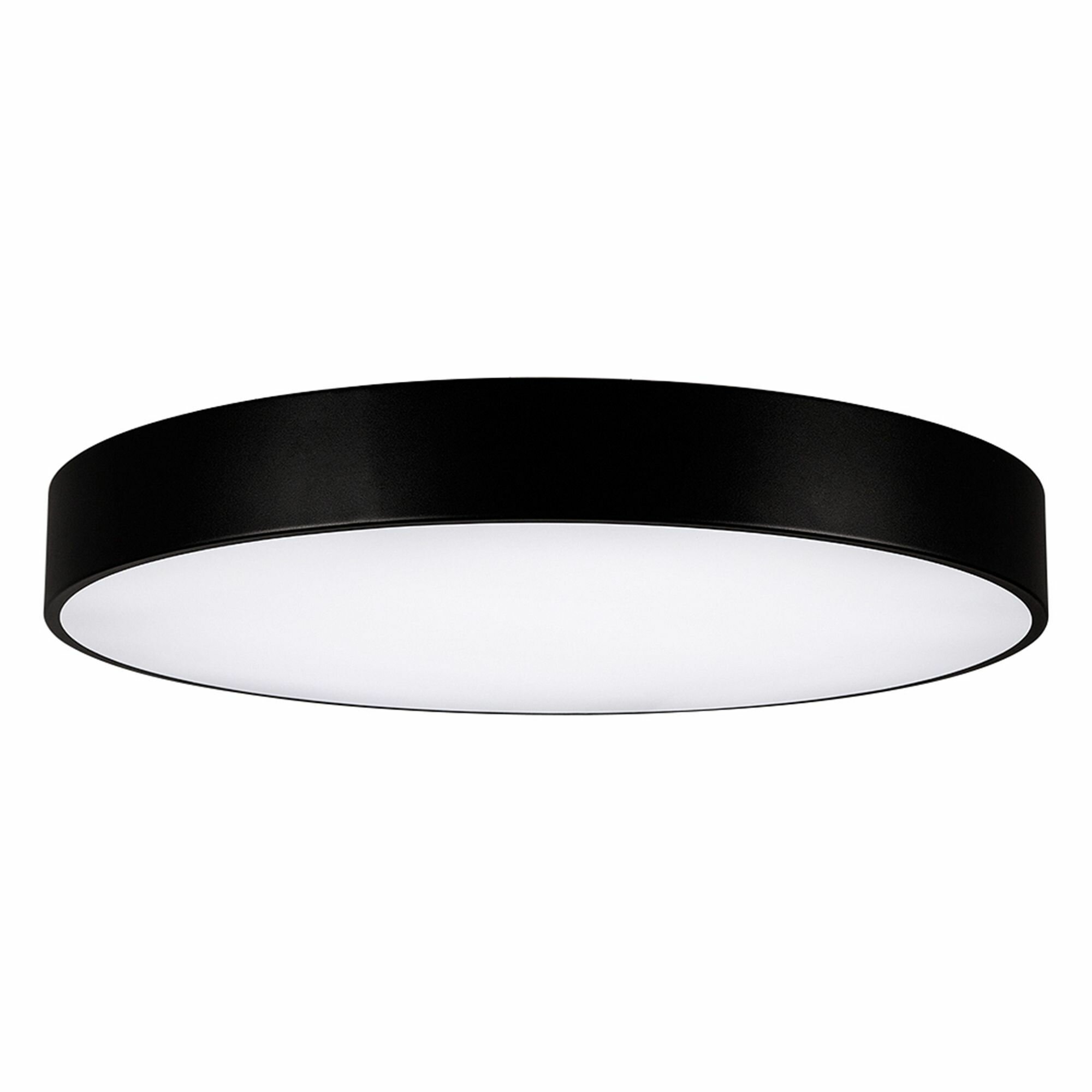 Накладной интерьерный светильник. Мощность 94 Вт, св. поток 8460 лм, 90 лм/Вт, теплый 3000 K, CRI>80, угол 120°, напряжение питания 230 В. Черный круглый корпус из алюминия, степень защиты IP20. Размер: диаметр 800 мм, высота 100 мм. Монтаж накладной. Драйвер 28-42 В, 1200 мА (2 шт.), пульсация