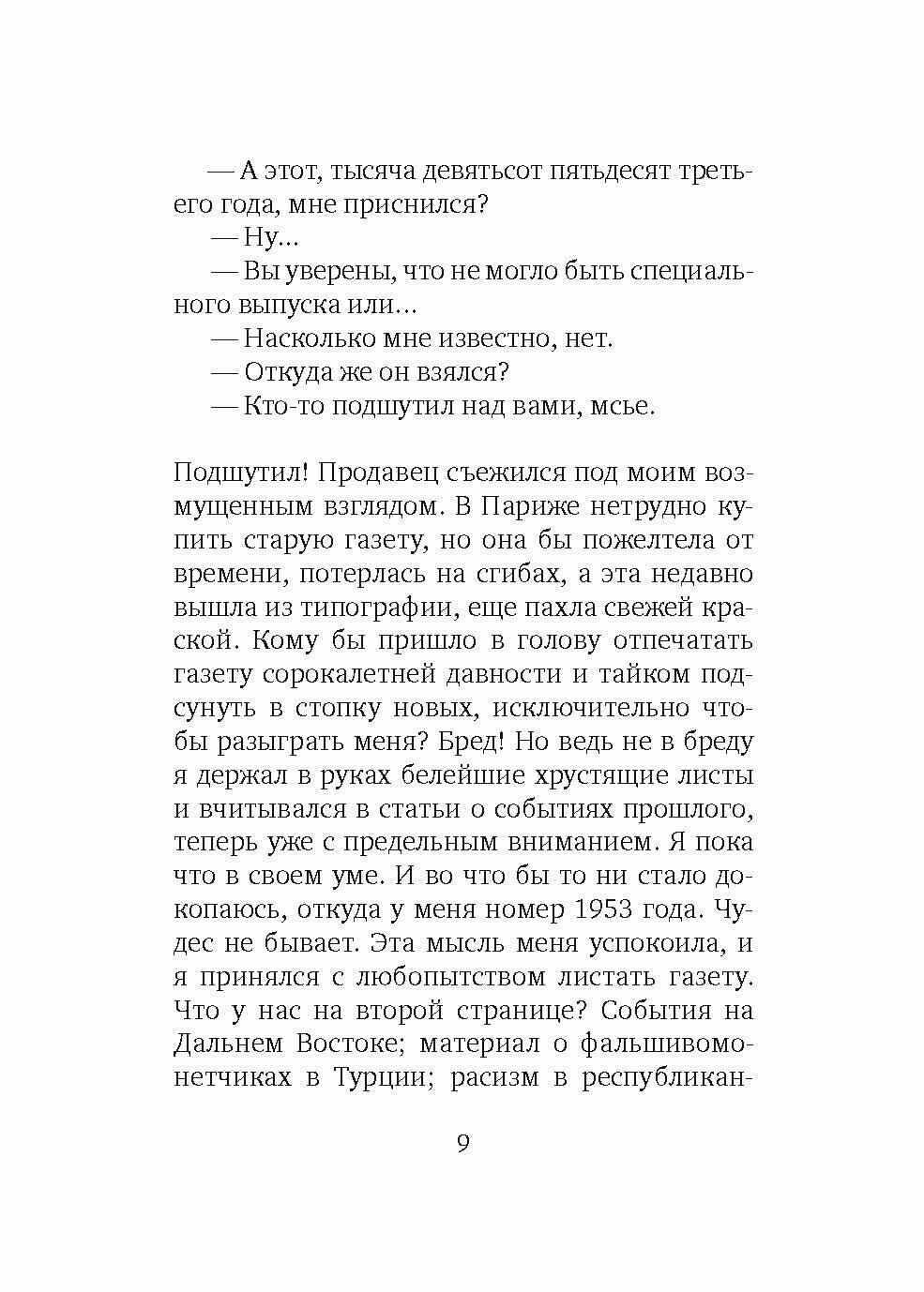 Мне понравился этот необычный маленький роман. Сам подзаголовок «роман-вымысел»сразу наталкивает на мысль, что перед нами не просто фикшн, а фикшн вдвойне: такая постоянная игра с читателем, о которой предупредили сразу же, ещё до первых строк. Так и оказывается. Здесь приходится размышлять на каждой странице, что это происходит — фантастическое допущение или описание прогрессирующего заболевания, или же какой-то неведомый социальный эксперимент. Реально ли все или же существует лишь в голове героя? Не подумайте, что это магический реализм. Скорее, буквализованная метафора: прошлое оживает в прямом смысле. Прыжки из 1995 в 1953, из взрослой жизни в детство, пестрый коллаж диалогов, фактов, и очень много Парижа: Парижа разного, явленного не только в прогулках по городу, но в разговорах с незнакомцами, в воспоминаниях. Париж здесь говорит едва ли не громче героя, и уж точно убедительнее: город не выдумывает, городу не кажется, Париж лишь выдаёт факты и на том его роль заканчивается.