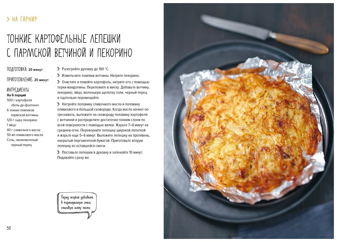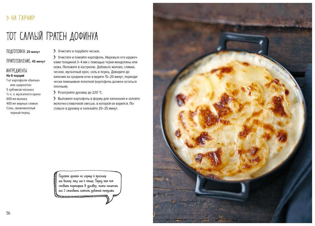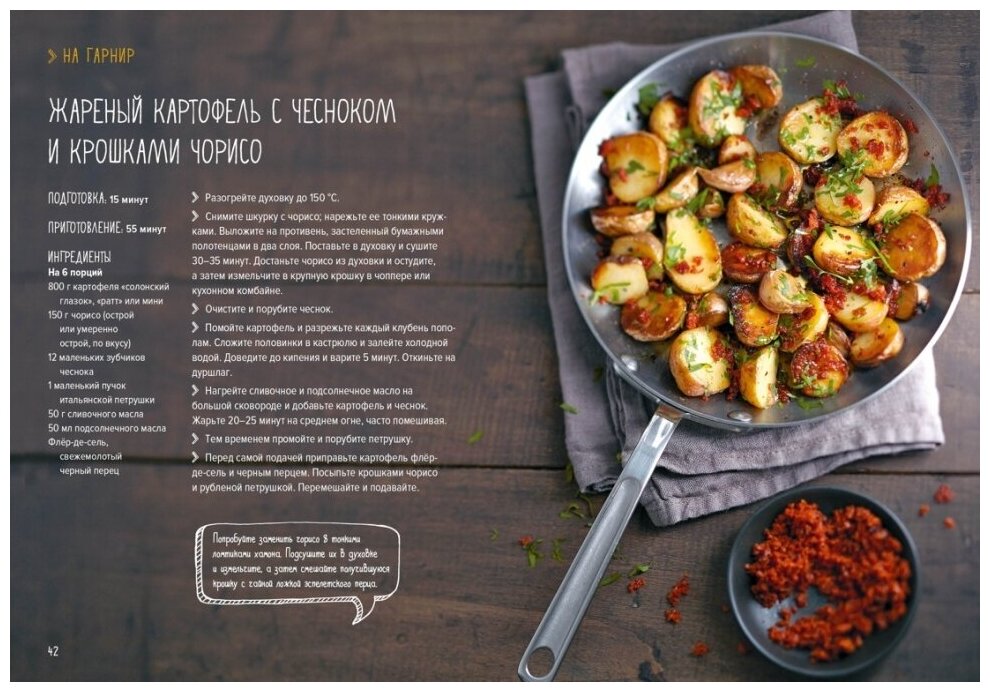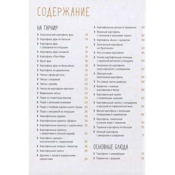 Приятная, красивая обложка. Качественные, очень плотные матовые страницы. Книга сама крепкая, небольшого формата. Наполненная качественными фото блюд. Блюда не сказать, что большого разнообразия. В основном это гарниры, чем самостоятельные блюда. За это снизила оценку. Ожидала чуть больше. А так есть несколько рецептов домашних чипсов, картофеля фри, шариков и пюре.