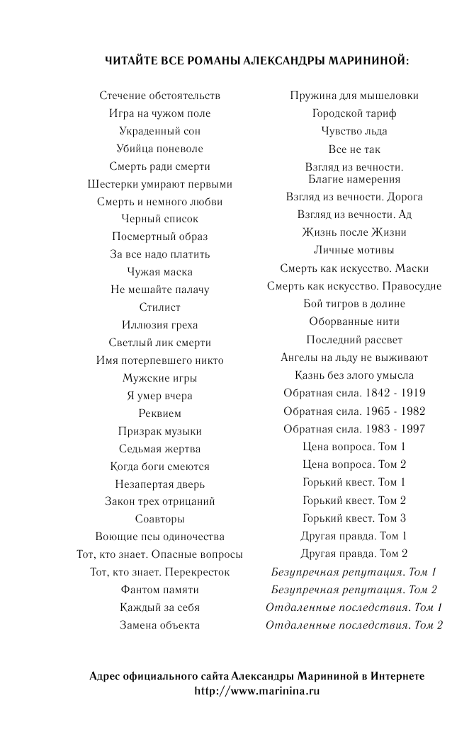 Ждала, пока поступит в продажу второй том, чтобы заказать оба сразу, потому что книги Александры Марининой читаю запоем, и мучиться "а что там дальше? " у меня бы не хватило нервов :)