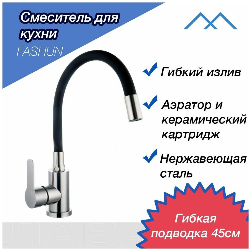 Все смесители марки Fashun отличаются эргономичным дизайном и изысканностью. Именно поэтому эти смесители для кухни и ванной отлично впишутся в интерьер любой стилистической направленности. Комфортность в использовании. Смесители максимально удобны при эксплуатации, всего одним движением руки можно закрыть или открыть воду. Данная модель смесителя для кухни оснащена гибким силиконовым изливом, цвет: черный. Технология производства: токарная обработка;