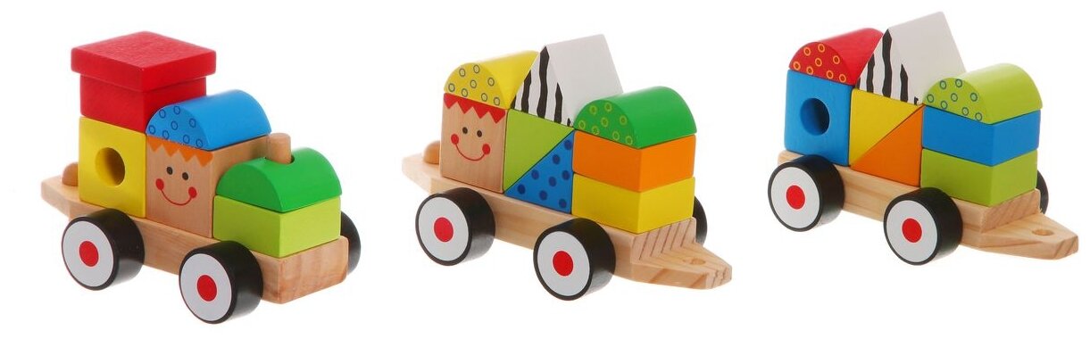 В наборе: 3 платформы на колесах, 22 кубика с отверстиями.