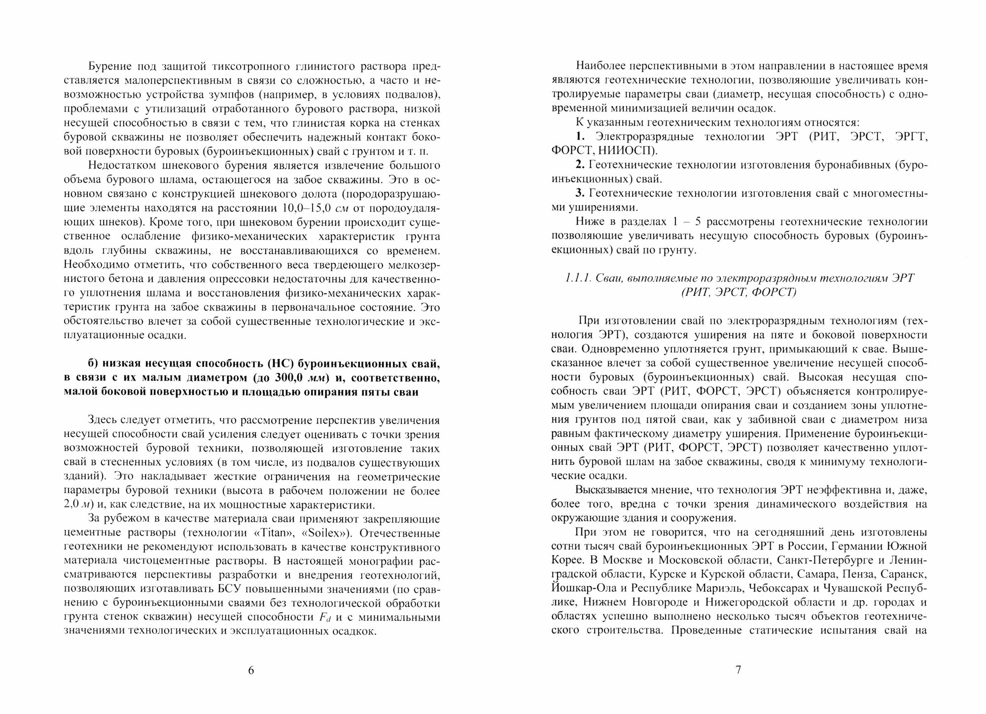 Приведены методы и разработаны методики расчетов несущей способности буроинъекционных свай повышенной несущей способности Fd по грунту. Разработанные алгоритмы расчета Fd апробированы в полевых условиях в течение длительного периода времени. Показано хорошее соответствие результатов теоретических расчетов и экспериментальных исследований. Описаны технологии создания буроинъекционных свай ЭРТ (РИТ, ФОРСТ, ЭРСТ), технологии строительства новых зданий в условиях старой застройки, а также технологии обеспечения устойчивости склонов.