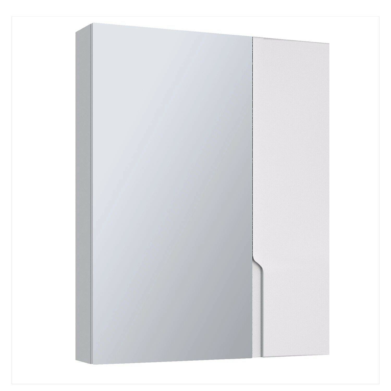Зеркальный шкаф для ванной Runo Стокгольм 00-00001126. Зеркальный шкаф для ванной без подсветки c двумя ассиметричными дверками, одна из которых зеркальная, а вторая - белая. Внутри шкафа - две горизонтальные полки. Петли со встроенным доводчиком.