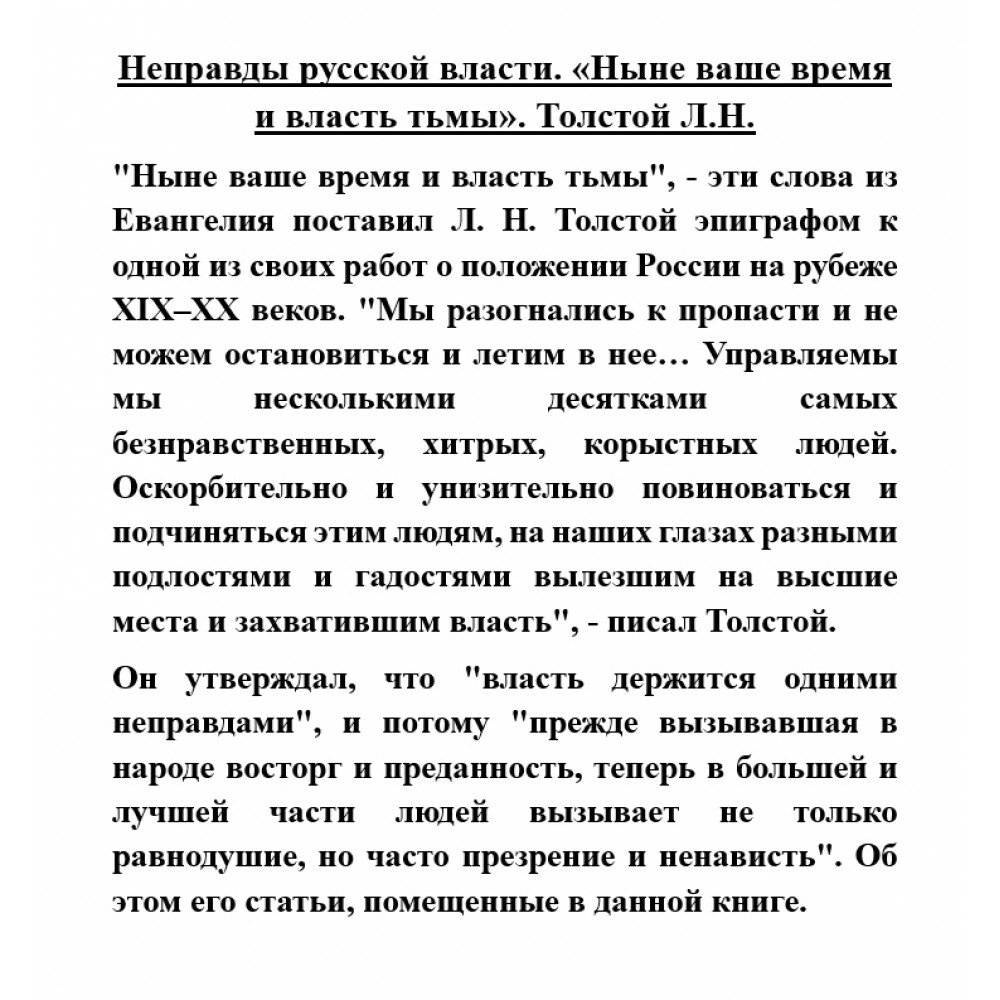 «Ныне ваше время и власть тьмы», – эти слова из Евангелия поставил Л. Н. Толстой эпиграфом к одной из своих работ о положении России на рубеже XIX-XX веков. «Мы разогнались к пропасти и не можем остановиться и летим в нее… Управляемы мы несколькими десятками самых безнравственных, хитрых, корыстных людей. Оскорбительно и унизительно повиноваться и подчиняться этим людям, на наших глазах разными подлостями и гадостями вылезшим на высшие места и захватившим власть», - писал Толстой. Он утверждал, что «власть держится одними неправдами», и потому «прежде вызывавшая в народе восторг и преданность, теперь в большей и лучшей части людей вызывает не только равнодушие, но часто презрение и ненависть». Об этом его статьи, помещенные в данной книге