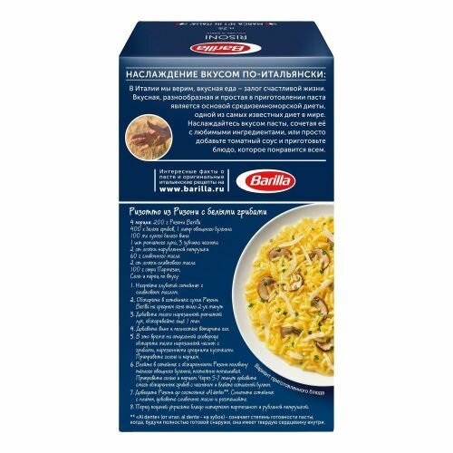 Описание товара:На создание этой мелкой пасты вдохновила форма рисовых зерен. Макароны Ризони идеально подходят для приготовления супов, но они очень универсальны и широко используются также для основных блюд и гарниров. Попробуйте ризони в салатах, а для неожиданного поворота замените рис арборио макаронными изделиями Barilla Risoni в своем следующем ризотто - они обладают твердой текстурой al dente традиционного арборио, а их форма и аутентичный итальянский вкус добавляют новое измерение традиционному блюду.Состав товара:Вода, мука из твердой пшеницы высшего сорта.Способ приготовления:Варить 10 минут в кипящей подсоленной воде.Меры предосторожности:Может содержать следы соевых продуктов.