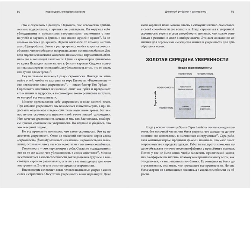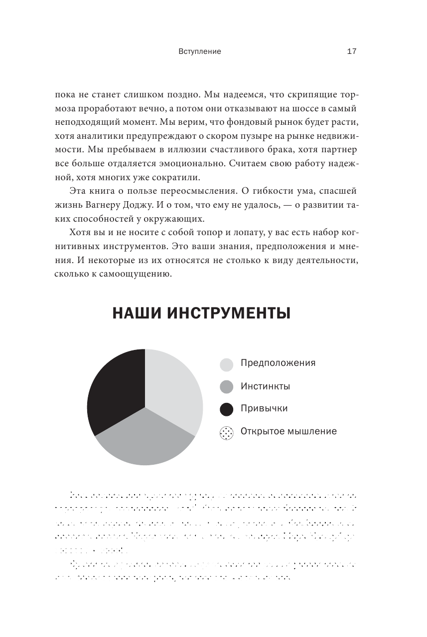 Интеллект обычно рассматривается как способность думать и учиться, но в быстро меняющемся мире есть еще один набор когнитивных навыков, которые могут иметь большее значение: способность переосмысливать и переучиваться. В повседневной жизни слишком многие из нас предпочитают комфорт убеждений неудобству сомнений. Мы прислушиваемся к мнениям, которые заставляют нас чувствовать себя хорошо, а не к идеям, призывающим задуматься. Мы рассматриваем разногласия как угрозу нашему эго, а не как возможность учиться. Мы окружаем себя людьми, которые согласны с нашими выводами, тогда как нам следует тяготеть к тем, кто бросает вызов нашему мыслительному процессу.Если знание — это сила, то знание того, чего мы не знаем, — это мудрость. В этом уверен профессор Адам Грант. Его новая книга поможет:- Освоить навык, который Рэй Далио в своих "Принципах" называет ключевым — умение смотреть на реальность без предубеждений.- Открыть в себе внутреннего Ученого: бесконечно любопытного, настроенного скептически, в меру уверенного в себе. Научиться менять взгляд на вещи.- Формировать содержательные, а не межличностные конфликты, чтобы вести свою команду или группу к поиску решения.- Подталкивать других людей к тому, чтобы они пересматривали устоявшееся видение и мыслили в рамках научного подхода.- Создавать сообщество людей, которые учатся новому в течение всей жизни.Обо всем этом Адам Грант рассказывает увлекательно, с юмором и примерами из самых разных сфер, с блестяще подобранными иллюстрациями и графиками, которые способствуют легкости чтения.Книга Адама Гранта показывает, что нам не нужно верить всему, что мы думаем, или усваивать все, что чувствуем. Это приглашение отказаться от взглядов, которые больше не служат нам, и ценить умственную гибкость выше глупой последовательности.Фишки книги:- Рекомендуют Билл Гейтс и Даниэль Канеман.- Бестселлер Амазон — 6 недель в топ-10 среди всего нон-фикшн.- Более 1000 оценок на Amazon и 3,5 тыс. оценок на Goodreads за 1 месяц.- Книга переведена на 41 язык.- В США и Канаде продано более полумиллиона экземпляров.Для кого книга:Для всех, кто хочет научиться критически оценивать реальность и свои решения, переосмысливать и переучиваться, двигаясь вперед.