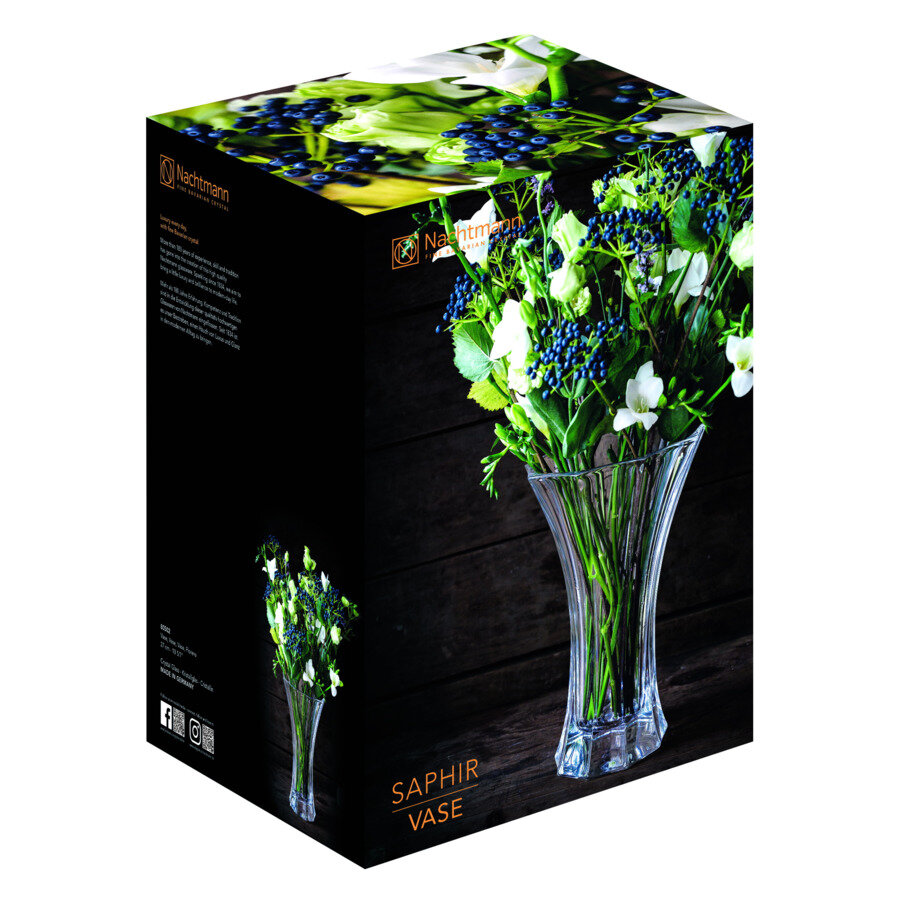 Немецкая компания Nachtmann, основанная в 1834 году, занимается изготовлением хрустальной посуды уже почти двести лет. За столь длительное время работы ее мастера накопили такой опыт, который позволяет создавать не просто посуду, а настоящие произведения искусства – шедевры. Уникальная технология, предающаяся из поколения в поколение, позволяет резать грани таким образом, что лучи света преломляются и вызывают фонтан бриллиантовых брызг. Бокалы, фужеры, вазы, тарелки и блюда и другая посуда Nachtmann изготавливается из высококачественного хрусталя. Благодаря современным технологиям производства кристальная прозрачность и потрясающий блеск посуды сохраняется многие годы, а нежный звон бокалов воистину неповторим. Сегодня мастера используют и стекло, которое выглядит также прекрасно, как и хрусталь, однако придание стеклу формы происходит только вручную, что гарантирует качество каждого предмета посуды.Вазы для цветов – самый распространенный предмет, используемый для украшения интерьеров, это элегантное и в то же время функциональное украшение. Хрустальные вазы Nachtmann, благодаря разнообразию форм и расцветок, могут стать декоративным элементом гостиной, спальни и любой другой комнаты. Современные формы, интересная цветовая гамма и необычная гравировка, придающая хрусталю особенное сияние, делают вазы Nachtmann популярными во всем мире. Каждая коллекция имеет собственный неповторимый рисунок: очаровательная «плетенка», успокаивающие волны, расходящиеся линии и концентрические окружности – фантазия дизайнеров кажется безграничной.Ваза понравится ценителям изящных линий и будет прекрасным украшением Вашего дома. Цветы, будь то сложные композиции или скромные полевые ромашки, приобретают в такой вазе особое очарование. Совершенные грани хрустальных ваз коллекции Saphir напоминают о великолепии одноименного драгоценного камня.