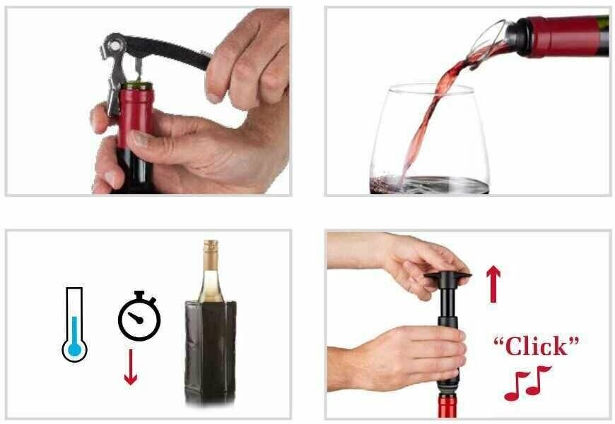 | Состав набора | вакуумный насос; охлаждающий чехол; штопор; аэратор для вина; пробка для бутылки |