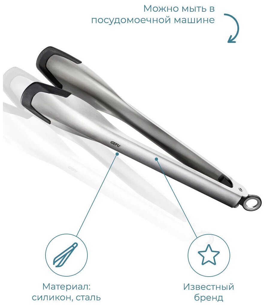 С кухонными щипцами ''Gefu'' Вы с легкостью сможете переворачивать горячие блюда на сковороде или гриле. Термостойкая ребристая силиконовая кромка щипцов защитит от царапин посуду с антипригарным покрытием. Практичный механизм блокировки обеспечивает компактное хранение щипцов.