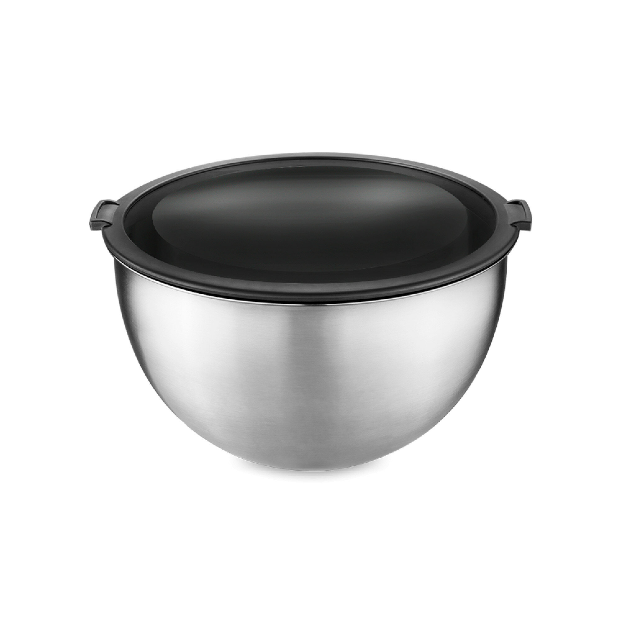 Универсальная миска с крышкой изготовлена из нержавеющей стали - матовой снаружи и глянцевой внутри. На внутреннюю поверхность нанесена мерная шкала - до 1 л. Герметичная прозрачная крышка окантована силиконом. Дно миски покрыто силиконом для устойчивости на столе.