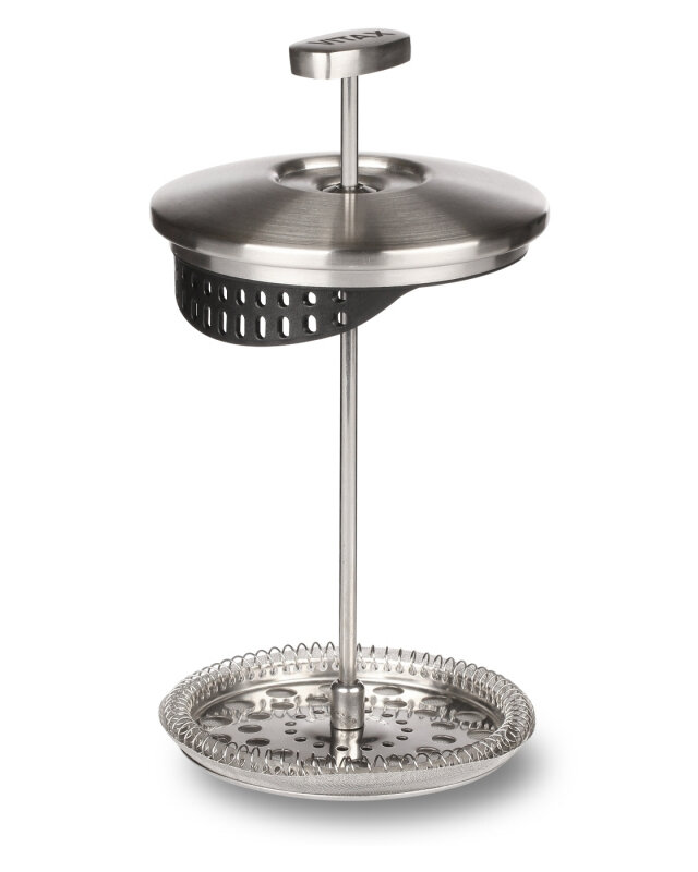 Объём: 1000 мл. Колба из высококачественного, особо прочного, термостойкого боросиликатного стекла. Поршень и фильтр изготовлены из высококачественной пищевой нержавеющей стали 18/10. Термо-сберегающая крышка из нержавеющей стали и пластика. Корпус френч-пресса изготовлен из высококачественной нержавеющей стали. Подходит для мытья в ПММ.