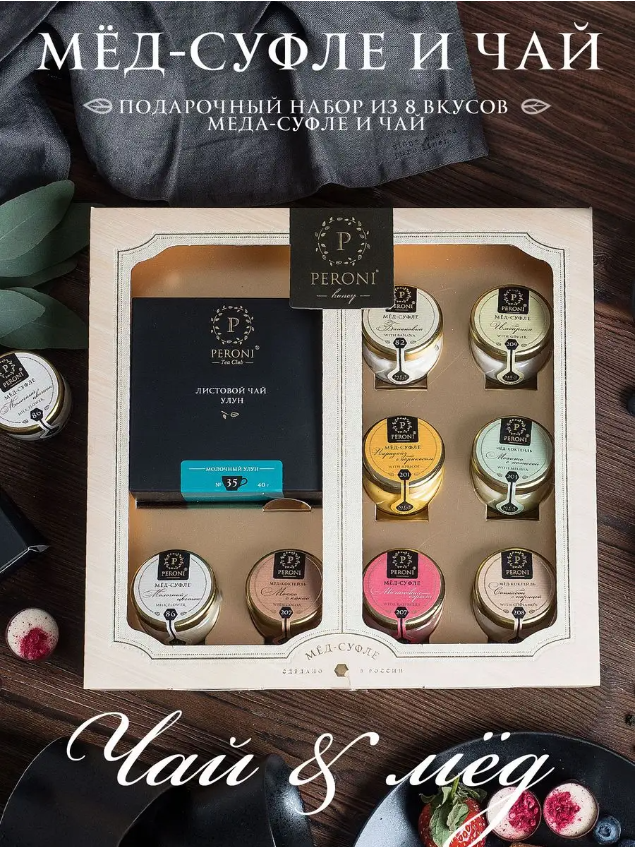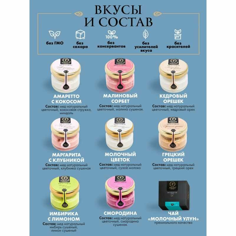- мёд-суфле с различными вкусами - 8 баночек по 30 мл;