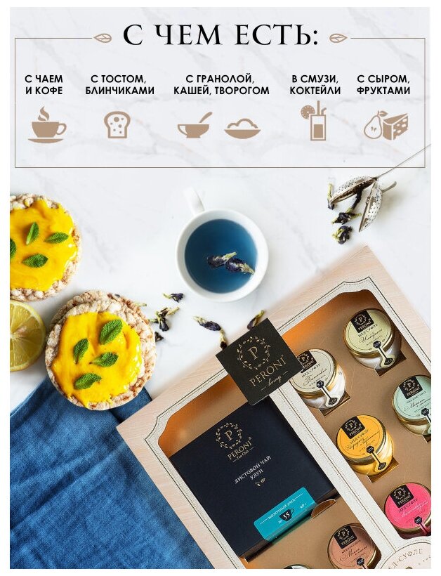 | Состав | Чай черный байховый. Амаретто с кокосом мёд натуральныйцветочный, кокосовая стружка, миндаль. Кедровый орешек мёд натуральный цветочный, ядра кедрового ореха. Грецкий орешек мёд натуральный цветочный, ядра грецкого ореха Маргарита с клубникой мёд натуральный цветочный, клубника сушеная Малиновый сорбет мёд натуральный цветочный, малина сушеная Имбирика с лимоном мёд натуральный цветочный, имбирь сушеный, лимон сушеный Смородина мёд натуральный цветочный, смородина сушеная Молочный цветок мёд натуральный цветочный, сухое молоко. |