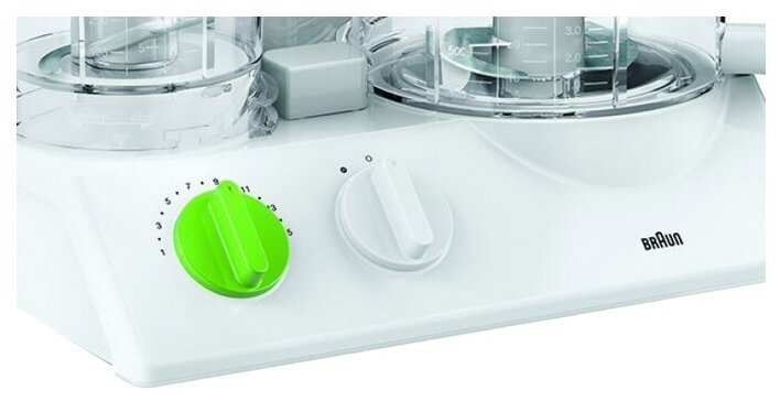 Braun - это кухонный комбайн, выполненный из качественного пластика белого цвета с ярким зеленым колесиком управления. Отличительной особенностью прибора является наличие двух чаш - маленькой объемом 750 мл и большой объемом 2 литра, которые могут работать одновременно. Мощность прибора составляет 600 Вт, поэтому процесс готовки занимает считанные секунды. Ножи и насадки выполнены из прочной стали, поэтому прослужат достаточно долго.