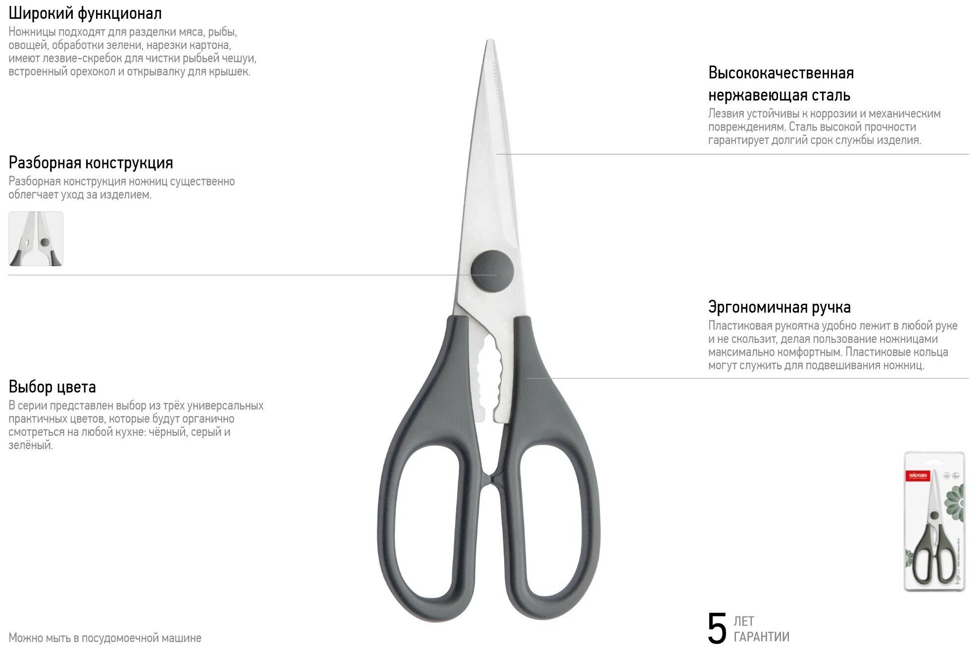 Ножницы изготовлены из высококачественной нержавеющей стали и подходят для разделки рыбы, мяса и птицы, обработки зелени, овощей и резки картона. Ножницы имеют встроенный орехокол, открывалку для крышек и лезвие-скребок для рыбьей чешуи. Разборная конструкция упрощает уход за изделием.