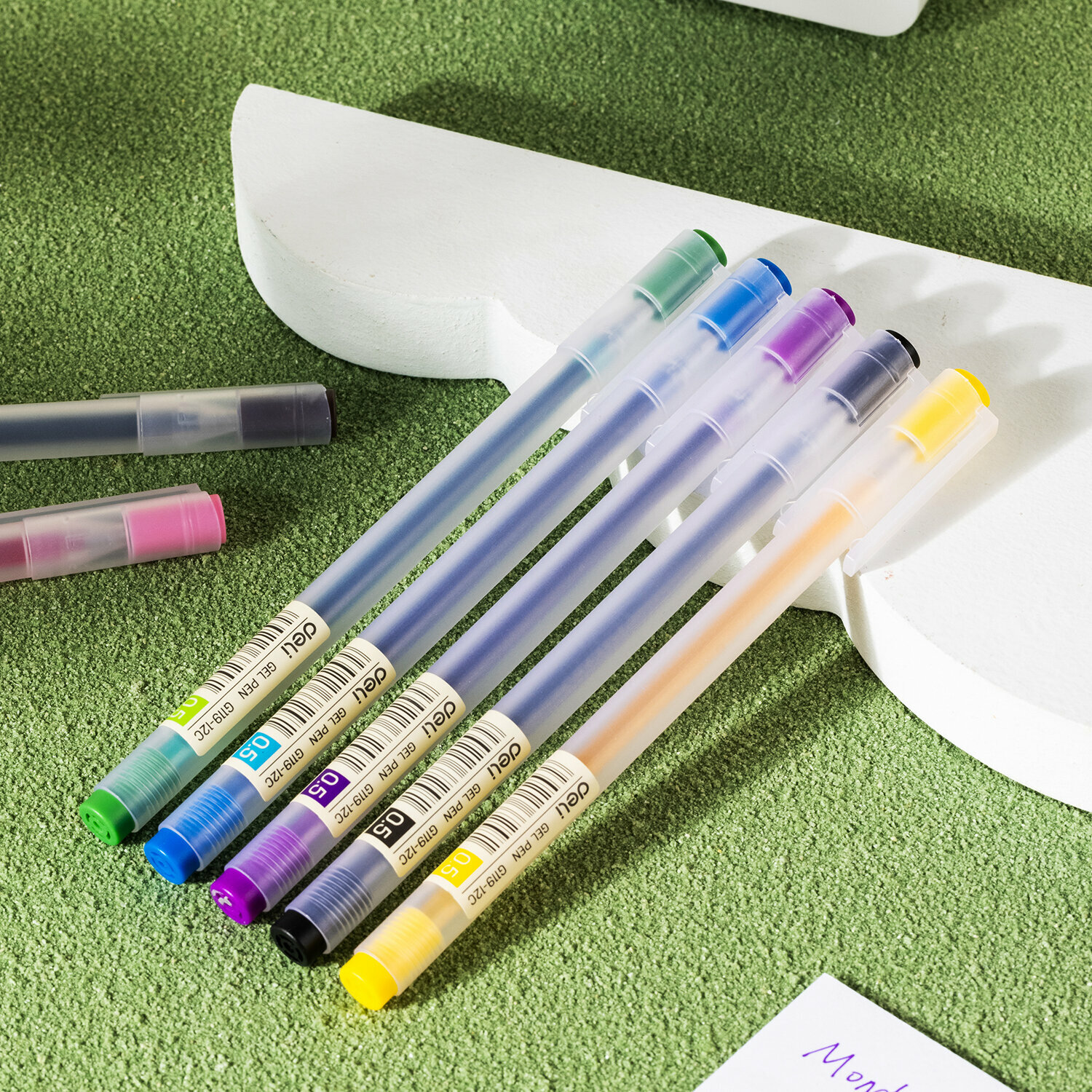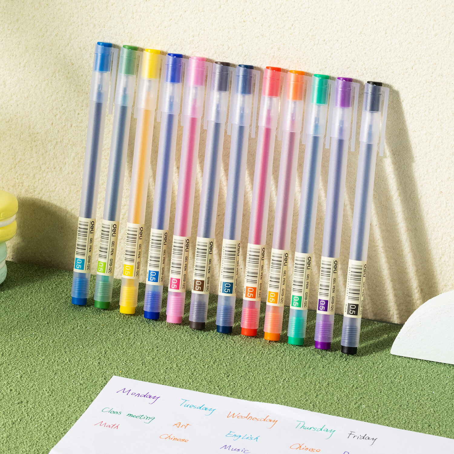 Набор гелевых ручек Deli, выполненных в приятном матовом пластиковом корпусе. Ручки имеют прочный металлический наконечник. В наборе ручки 12 цветов. Толщина линии - 0,5 мм. Ручками легко писать, они скользят по бумаге, обеспечивая мягкое письмо. Чернила быстро высыхают, не размазываются. Набор поставляется в прозрачной пластиковой упаковке, на которой имеется трафарет - ребенок с легкостью нарисует сердечко, цветок, звездочку, месяц и облако.