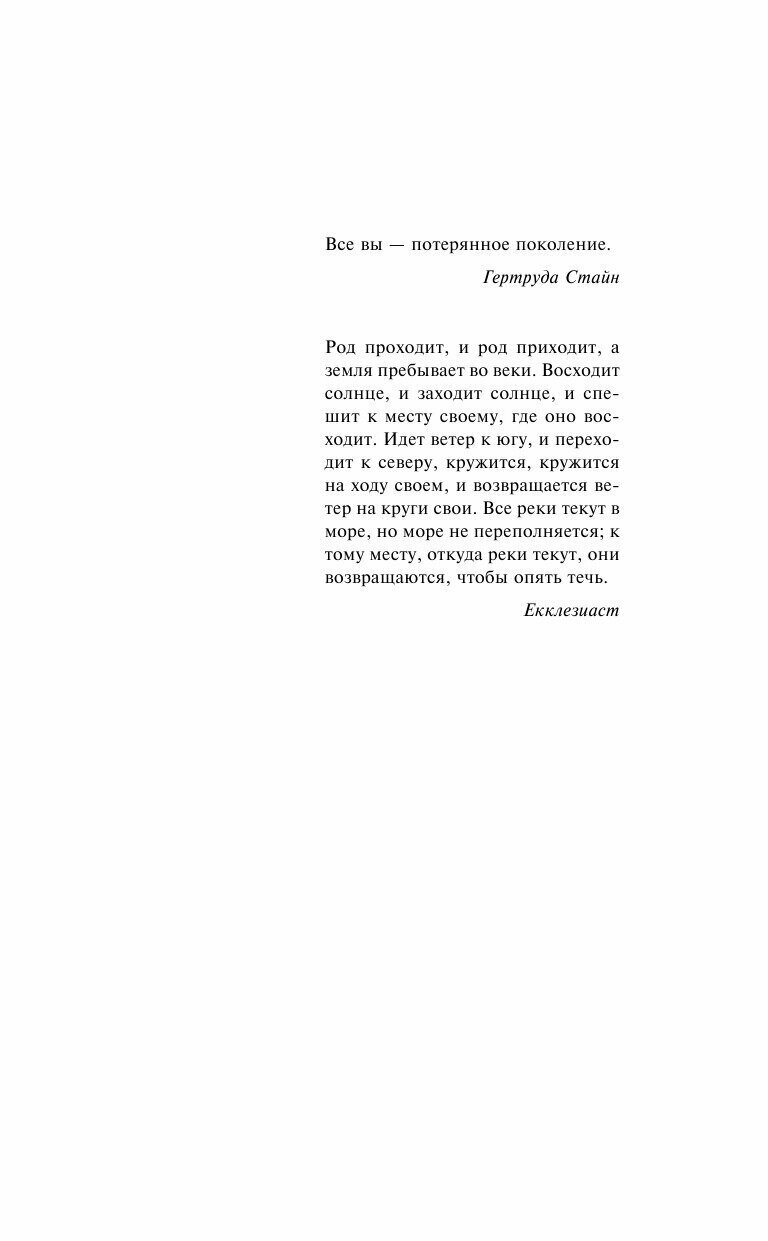 Роман дает читателю ощущение беззаботности, которое побуждает Джейка и его друзей путешествовать по Европе из Франции в Испанию на многодневную «фиесту» традиционной корриды. Также с группой путешествует Бретт, молодая женщина, которая соблазняет и отталкивает множество мужчин. Из всех главных героев я больше всего могу отождествить себя с Джейком, который иногда слишком много пьет, но в остальном кажется самым культурным. Несмотря на возраст, роман достоин прочтения, и, вероятно, не в последнюю очередь благодаря грандиозному переводу.