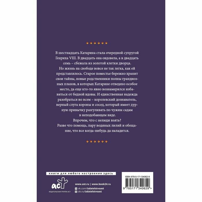 Как всегда у Карины Деминой, атмосферно, таинственно, мрачно. Но в отличие от других книг автора, есть историческая составляющая. И хотя действие происходит в параллельном мире, здесь есть Англия (правда ее столица называется не Лондон, а Лондиниум), Ирландия, Шотландия, Франция, присутствуют намеки на росских купцов и пр. Есть отсылки к Генриху VIII Тюдору и одной из его жен. В центре событий - судьба бывшей королевы. Катарине после смерти мужа не место во дворце - не враги, так друзья отправят в мир иной, потому что она - лишняя. Сын короля собирается жениться, и новой королеве вряд ли понравится наличие бывшей, которую будущий муж собирается сделать фавориткой. С этого начинаются события. А потом будут мрачный полуразвалившийся дом, странные твари, необычные соседи. Но рядом с королевой всегда ее верная компаньонка - мьесса Джио. Пожалуй, это единственный персонаж, который мне понравился на все 100 процентов. Ответственная, в меру добрая, умная, но иногда циничная и жесткая, она окружила подопечную поистине материнской заботой, несмотря на то что с ней сделал отец Катарины. Сама же бывшая королева мне не слишком понравилась. Если бы с ней рядом не было сильной и стойкой Джио, не известно, чем бы закончилась эта история. Детективная составляющая на высоте. Но вот любовная линия, на мой взгляд, слабовата. Тем не менее книга понравилась. Характерный рваный стиль автора придает повествованию определенный ритм и атмосферу. Герои живые, не картонные. Флэшбэки продуманы. Есть тонкий юмор. И, что радует, нет пошлости (впрочем, это характерно для всех книг Карины Деминой). А само повествование настолько завораживает, что мир и происходящие события кажутся реальными.