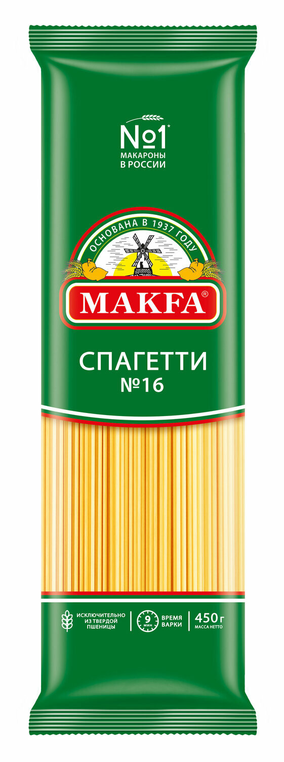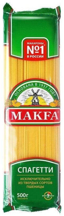 Описание товара:Спагетти от производителя Макфа - один из самых популярных и любимых видов макаронных изделий. Длинная вермишель изготавливается исключительно из твердых сортов пшеницы, что гарантирует высшее качество и пользу.Состав товара:Мука из твердой пшеницы для макаронных изделий высшего сорта, вода питьевая.Способ приготовления:Изделия засыпать в кипящую подсоленную воду и варить при умеренном огне до готовности, периодически помешивая. На 100г сухих изделий необходимо не менее 1л воды.Меры предосторожности:Хранить в чистых, сухих, незараженных вредителями помещениях. Может содержать следы яичных продуктов.