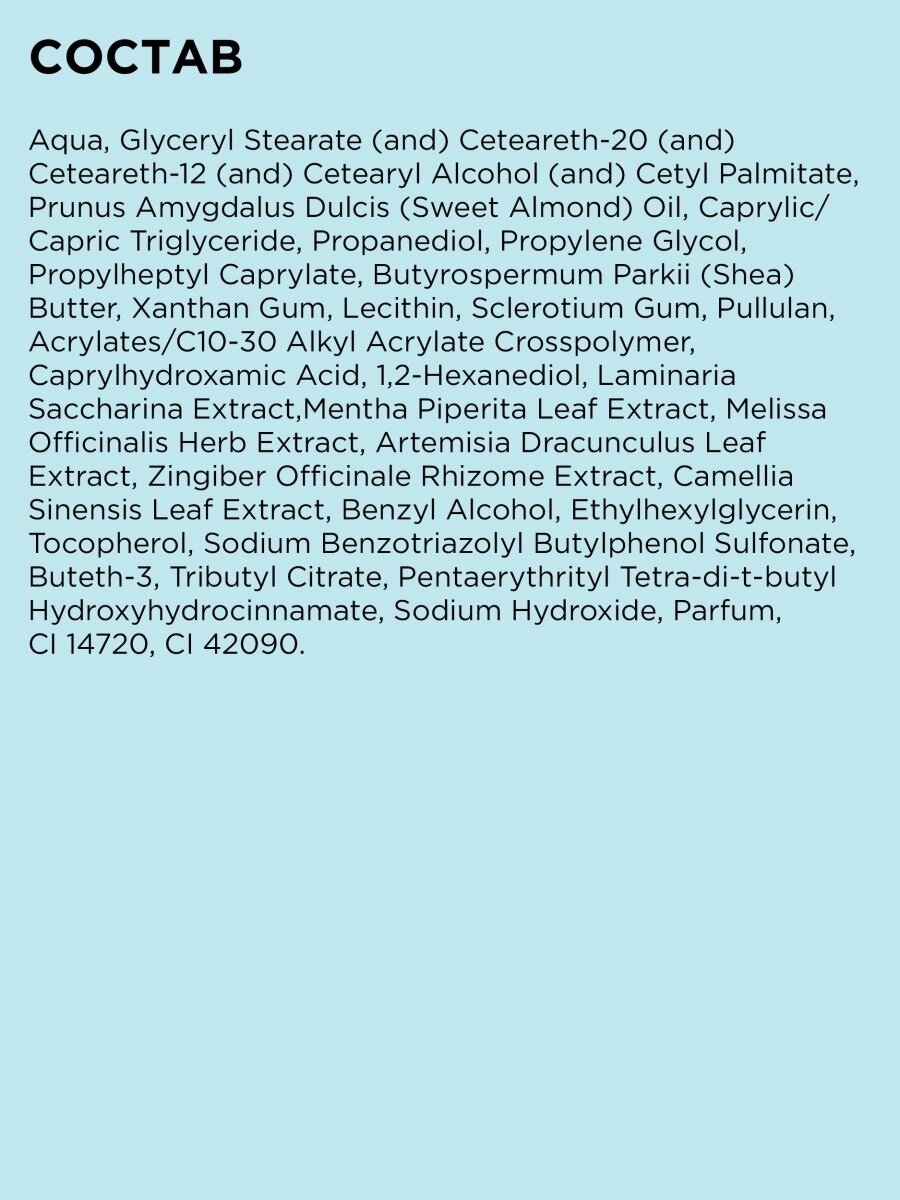 | Состав | Вода, Глицерил Стеарат (и) Цетеарет-20 (и) Цетеарет-12 (и) Цетеариловый Спирт (и) Цетил Пальмитат, Мaсло Сладкого Миндаля, Каприлик/Каприновый Триглицерид, Пропандиол, Пропиленгликоль, Пропилгептил Каприлат, Мaсло Ши, Ксантановая Камедь, Лецитин, Склеротиновая Камедь, Пуллулан, Акрилат/C10-30 Алкил Акрилатный Кроссполимер, Каприлгидроксаминовая Кислота, 1,2-Гександиол, Тетраметил Ацетилоктагидронафталины (ISO E Super), Сухой Экстракт Ананаса, Экстракт Манго, Экстракт Имбиря, Экстракт Меда, Экстракт Арники, Экстракт Клубники, Экстракт Зеленого Чая, Бензиловый Спирт, Этилгексилглицерин, Токоферол, Бензотриазолил Бутилфенолсульфонат Натрия, Бутет-3, Трибутил Цитрат, Пентаэритритил Тетра-ди-трет-бутил Гидроксигидроциннамат, Гидроксид Натрия, Парфюмерная Композиция, Бензоат Натрия, Сорбат Калия, CI 14720, CI 19140. |